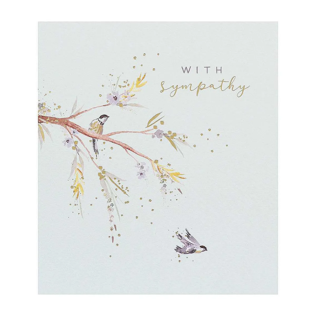 This Gorgeous Pale Green Card Is Decorate With Two Birds, One Perched On A Branch Covered In Flora And The Other In Mid-Flight. The Text Next To The Illustration Reads ‘With Sympathy’.
