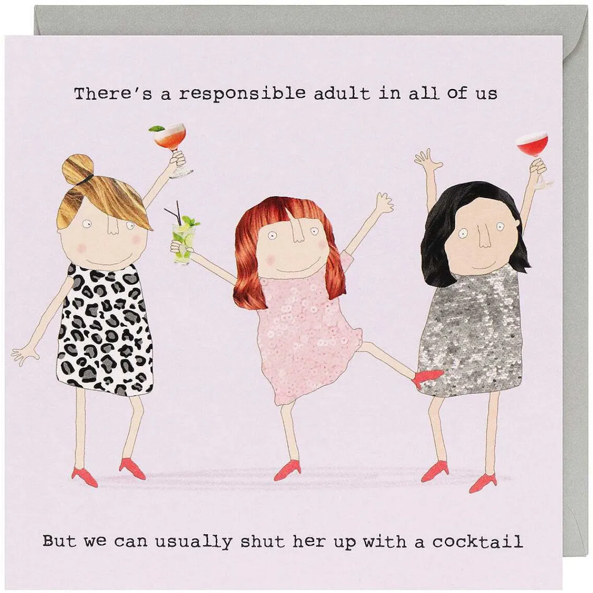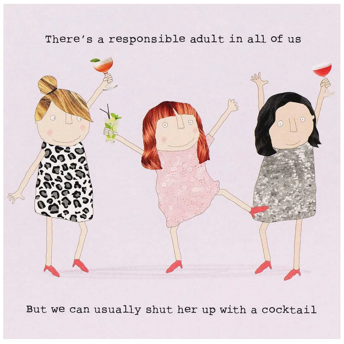 Designed Against A Pale Purple Background, This Card Features Three Girlfriends Dancing With Cocktails In Their Hands. The Text Above The Women, Which Is Printed In Black Typewriter Font, Reads;