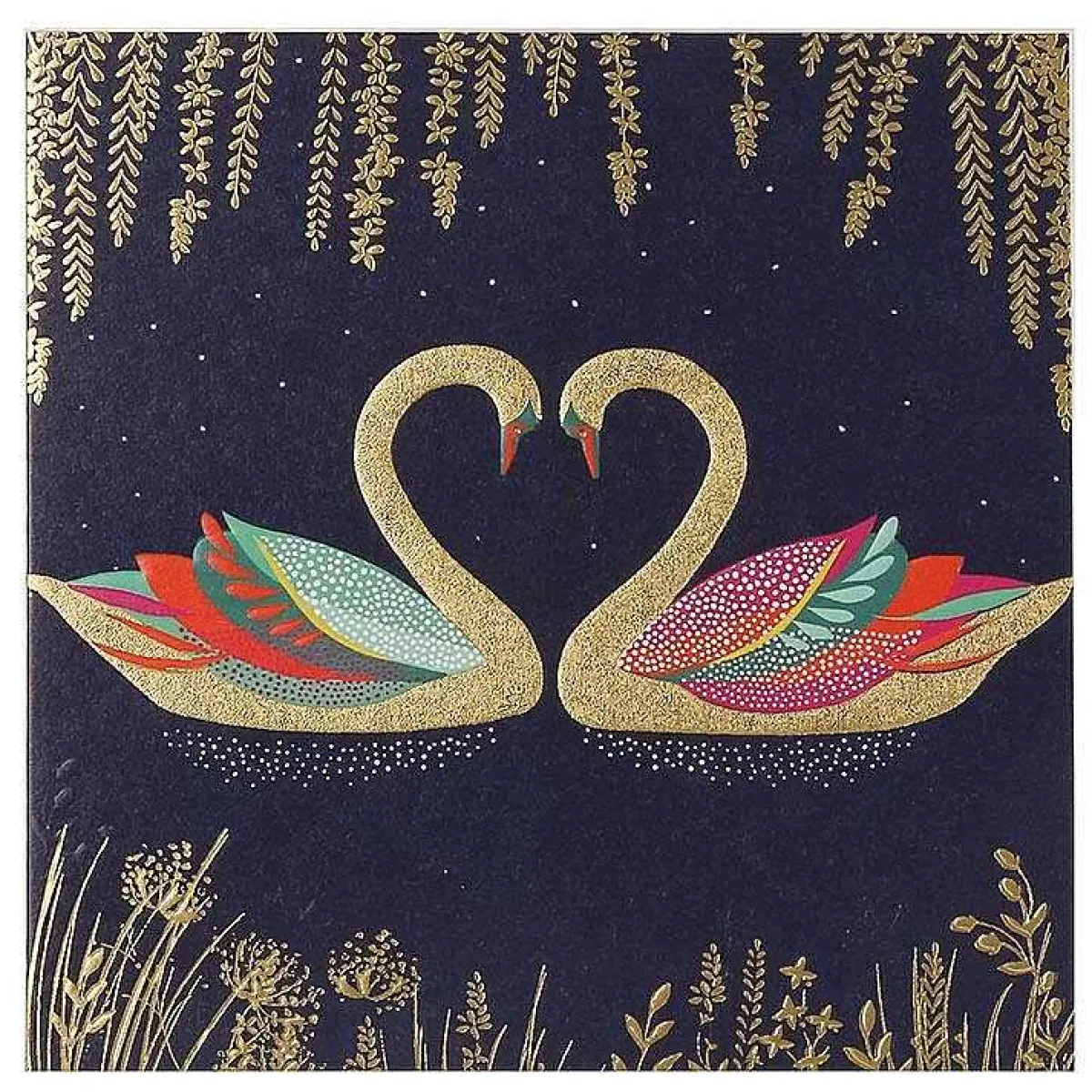 This Lovely Gold Foiled Greeting Card From Sara Miller Features A Pair Of Swans In Profile, Head To Head So That They Form A Heart Shape Between Them As They Float On Deep Blue Water. The Swans Are Embossed In Gold With Vibrant Wing Feathers In Shades Of Turquoise, Pink, Orange And Yellow. They Are Depicted On A Deep Blue Background, With Tiny Points Of Light In The Sky And Gold Foliage Overhanging Them And In The Foreground.
