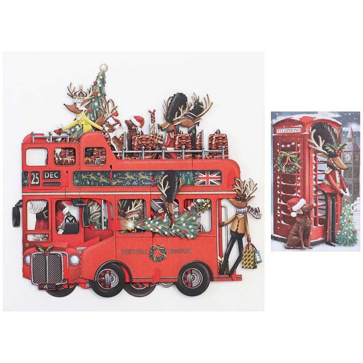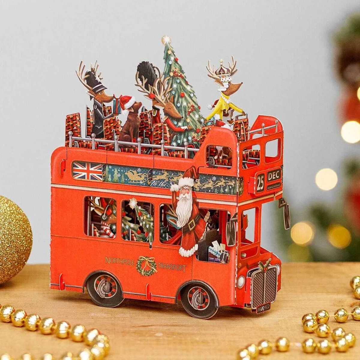 The Intricate Design Features Santa’S Reindeer Dressed In Vintage British Attire, Riding Aboard A Classic London Double-Decker Bus Draped With Christmas Decorations.