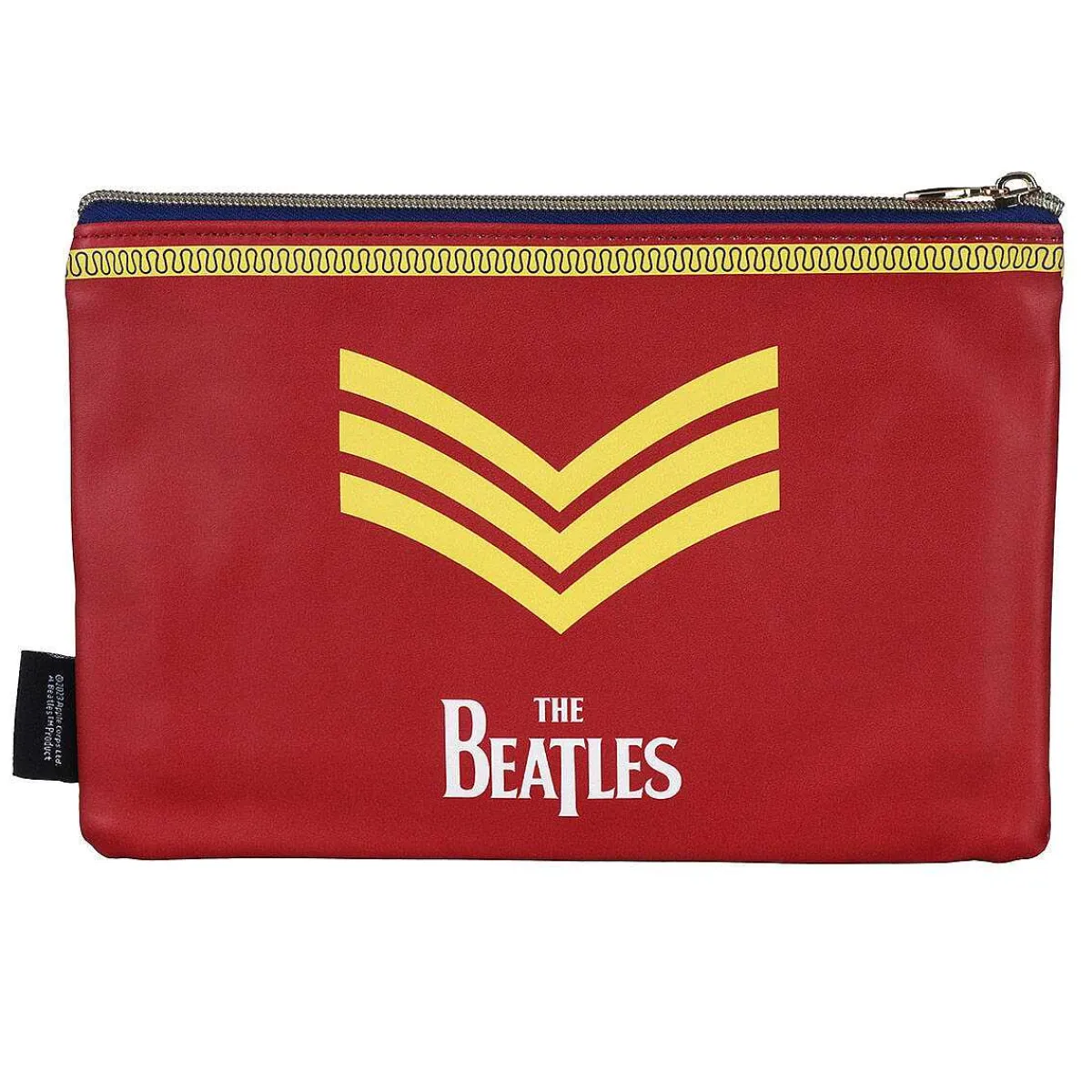This Awesome Pouch Has A Wipe Clean Surface; Perfect For Keeping Stationery, Makeup Or Arts And Crafts Items Safe. The Chic Beatles Design Features The Sgt. Pepper’S Lonely Hearts Club Band Logo Featured On A Drum On The Album Of The Same Name Set Against A Red Background With A Yellow Band Across The Top Of The Pouch. On The Reverse Are Three Stripes For Sergeant In Yellow Against The Same Red Background, Along With The Beatles Logo In White Across The Bottom. The Pouch Closes With A Gold Zipper On A Blue Fabric Which Matches The Colour Of The Lining Inside. This Stylish Case Will Look Great On Any Desk Or Dressing Table.