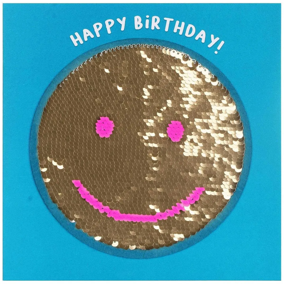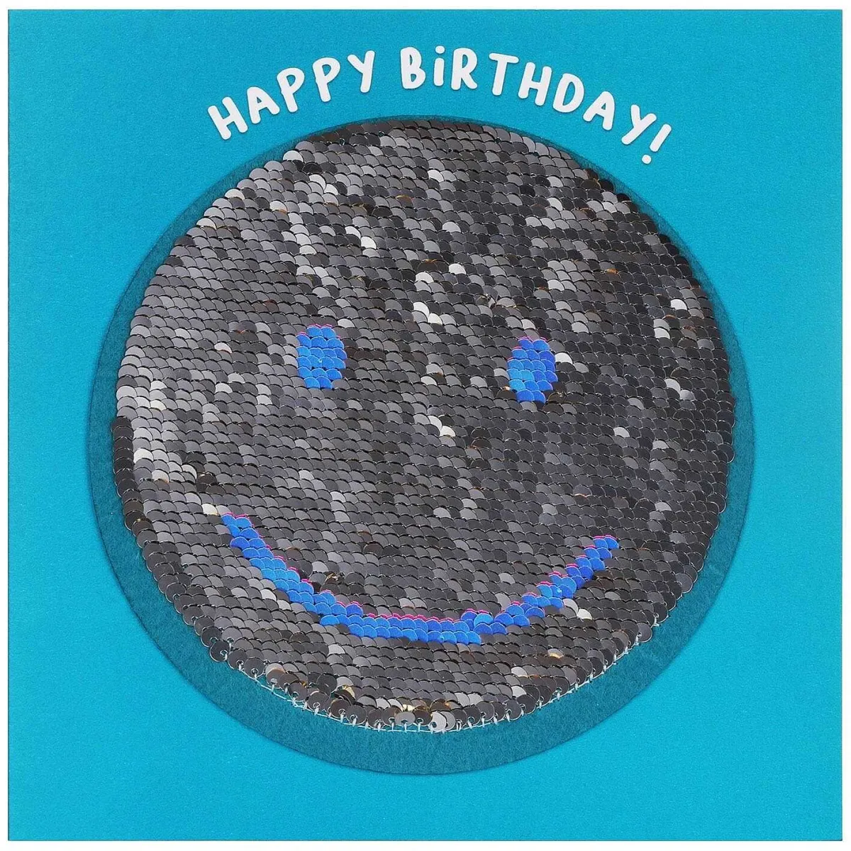 The Card Is A Bright Teal Colour With White Text That Says, ‘Happy Birthday!’ Above A Smiley Face That Is Made Up Of Gold And Pink Sequins Sewn Onto Teal Felt. But Run Your Hand Over The Design And The Sequins Reverse Showing A Face With A Different Colour Scheme Of Silver And Blue.