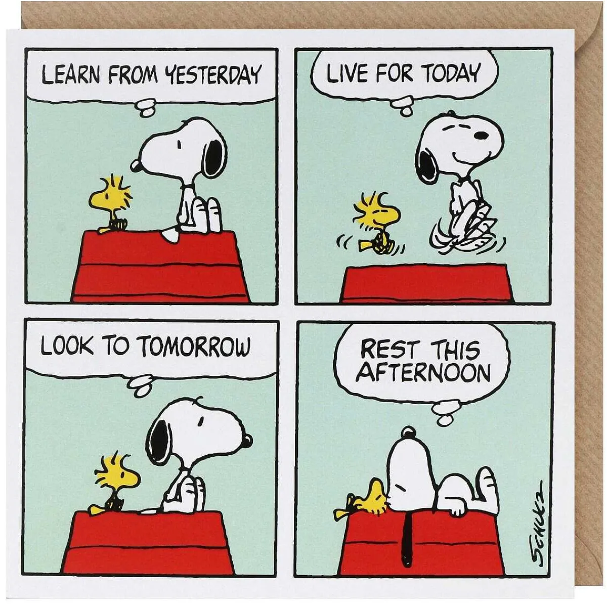 The Much-Loved Character Snoopy Is Captured In A Short Comic Series. Four Images Of Snoopy And Woodstock Sat On Top Of His Red Kennel, With The Text Which Reads…