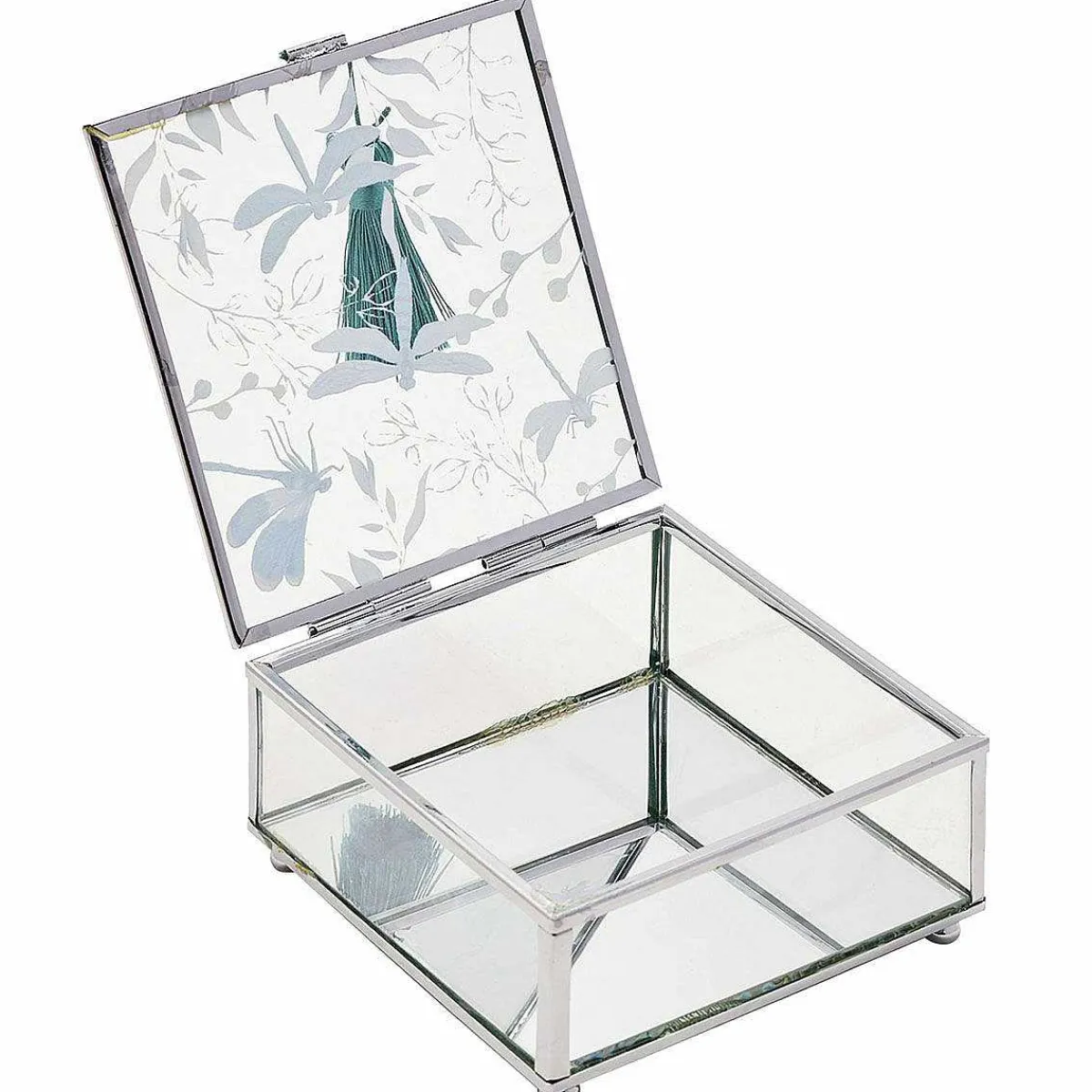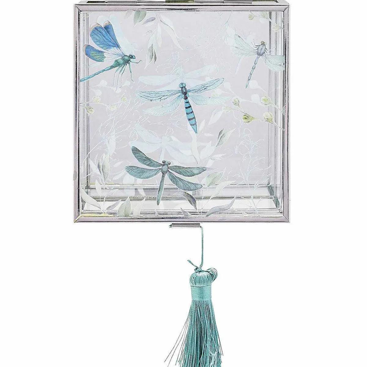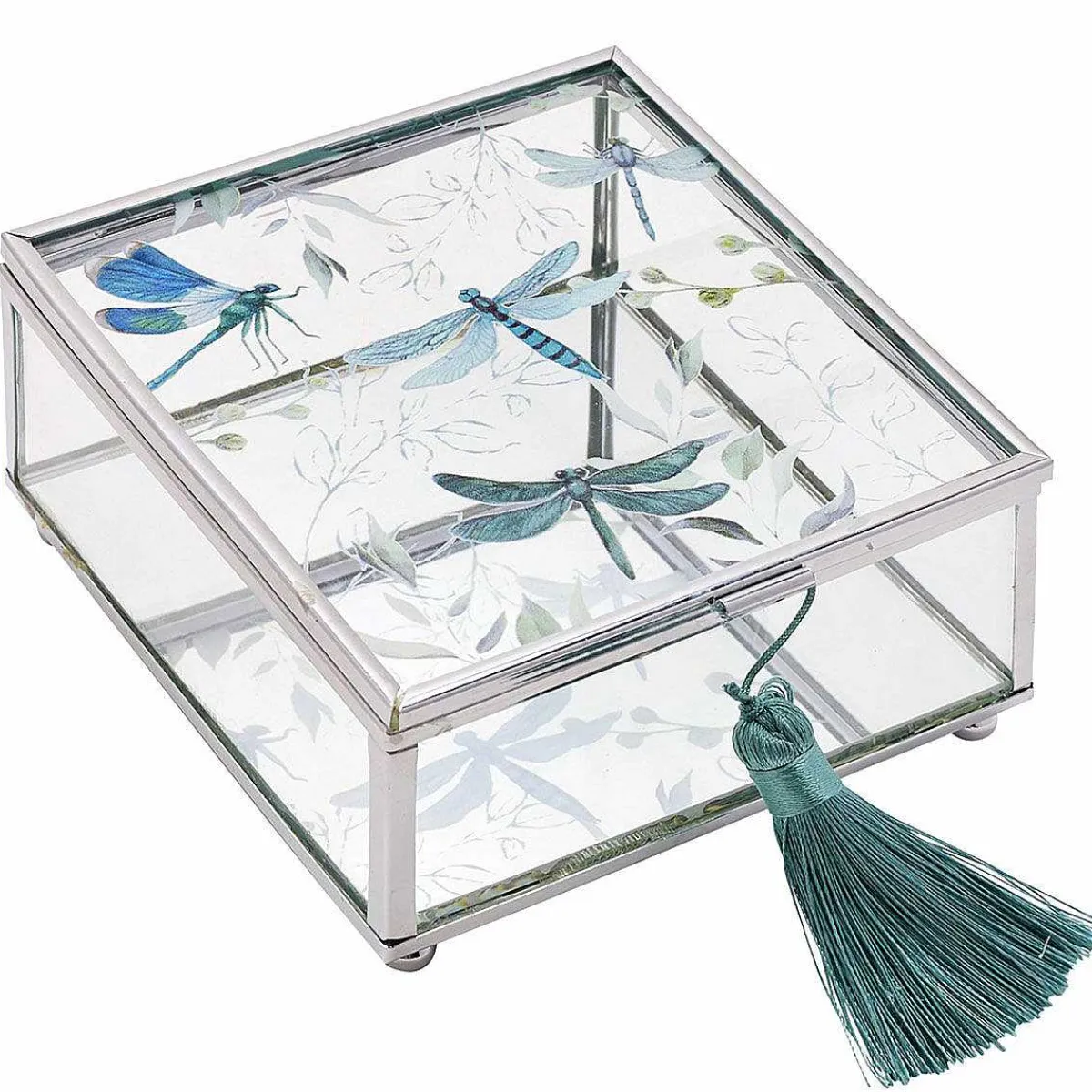 Made From Clear Glass, This Trinket Box Features A Mirrored Base And A Turquoise Tassel To Open The Lid. The Lid Is Decorated With A Wonderful Design Of Adorable Dragonflies Buzzing Around The Green Foliage. The Silver Edges Compliment The Design Beautifully, Making This Trinket Box The Perfect Piece To Keep On Your Dressing Table, Shelf Or Bedside Table.