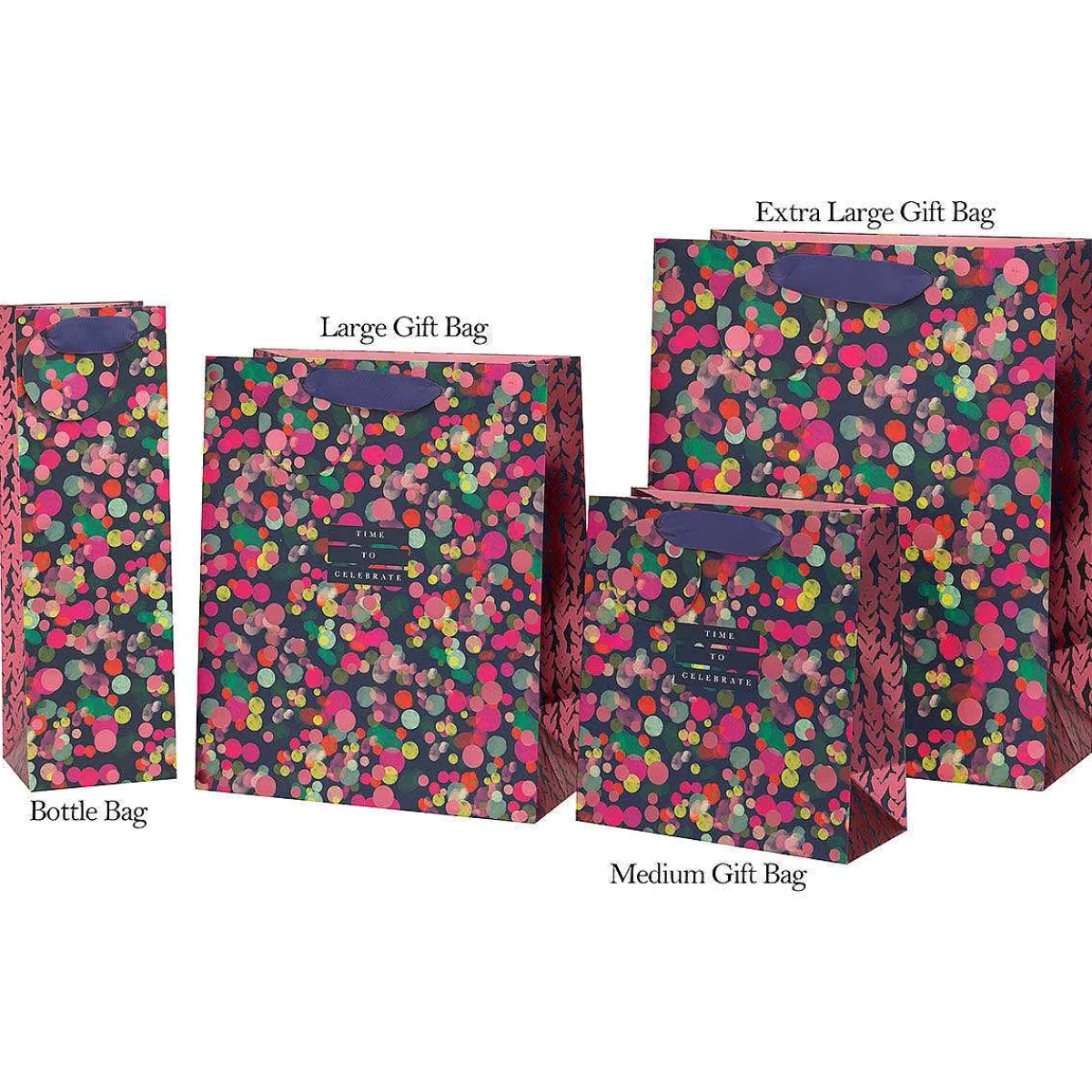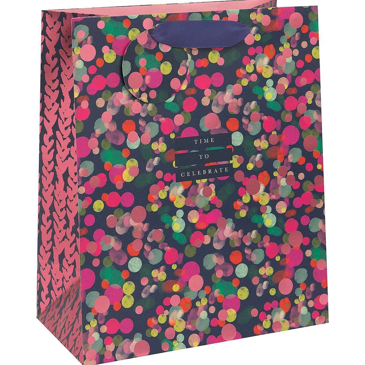 Give A Gift In This Stylish Gift Bag From Glick! This Large Gift Bag Is Vibrant And Beautiful, Perfect For Birthdays, Mother’S Day Or Any Celebratory Occasion. The Design By Stephanie Dyment Features The Words ‘Time To Celebrate’ In A Crisp White Font, With A Pink, Orange, Green And Shimmering Rose Gold Polka Dot Design On A Deep Navy Background. This Gift Bag Features Navy Wide Ribbon Handles And Comes With A Matching Circle Gift Tag For You To Personalise Your Own Message.