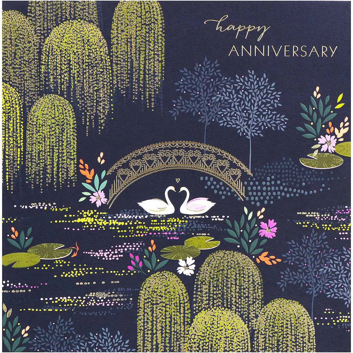 Perfect For Celebrating A Special Anniversary, This Large Gold Foiled Greetings Card From Sara Miller Depicts A Magical Scene With Two Graceful Swans Nestled Together On A Lake, Sitting Under An Arch Bridge Embellished With Golden Hearts. A Teal Background Is Adorned With Wisteria, Lily Pads, And Flowers. Shimmering Gold Foil Is Used Around The Card Which Adds A Luxurious Touch To The Design.