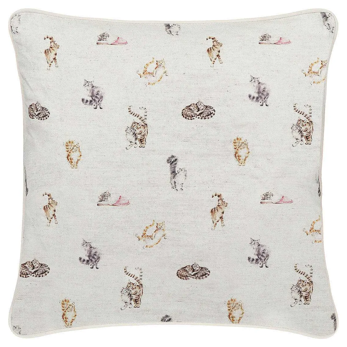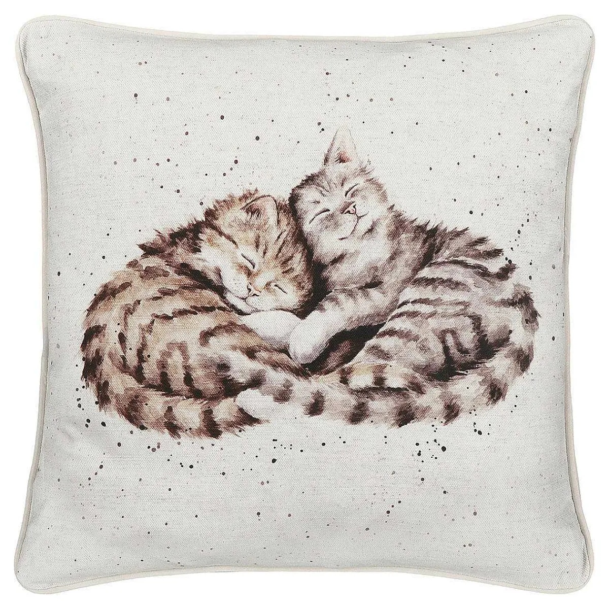 This Gorgeous Square Cushion Features A Beautiful Pair Of Kittens Snuggled Up Together Having A Nap, With Their Tails Intertwined. The Image Is Painted In Soft Greys And Browns With A Touch Of Pink In The Ears, In A Soft Water Colour Style. The Beautiful Design By Hannah Dale Is Set Upon A Beige Canvas Backdrop And Complete With The Trademark Speckles. On The Reverse Of This Cushion Is An Array Of Feline Themed Illustrations, Displayed In A Polka Dot Fashion Across The Beige Canvas Backdrop All In Different Poses. The Cushion Is Made From A Cotton Linen Blend And Filled With An Ethically Sourced Feather Inner, Finished With A Grey Pied Edge, Concealed Zip Fastening And The Wrendale Tag.