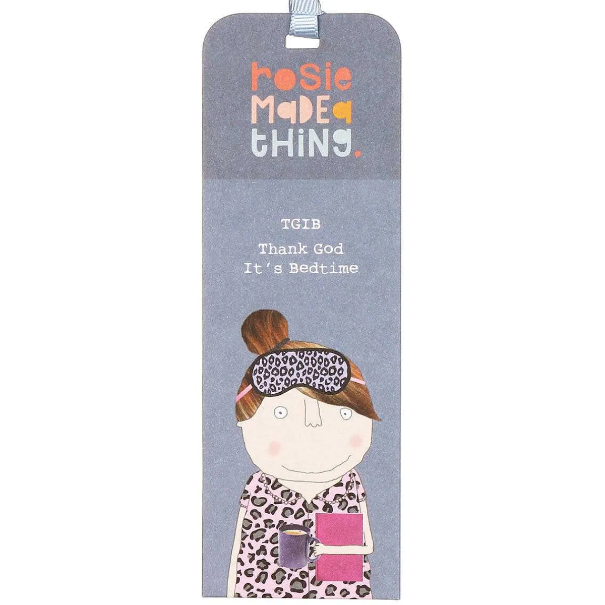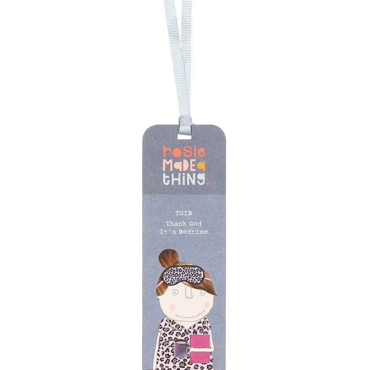 This Extra Thick Card Bookmark Will Help You Keep Your Page When Reading Your Favourite Book. The Bookmark Features A Fun Illustration Of A Lady In Her Pyjamas With An Eye Mask, Holding A Brew And A Book Tucked Under Her Arm. The Slogan Above The Illustration Reads; ‘Tgib Thank God It’S Bedtime’. Across The Top Of The Bookmark Is The Rosie Made A Thing Logo On A Grey Background, Complete With A Pale Blue Ribbon Attached At The Top.
