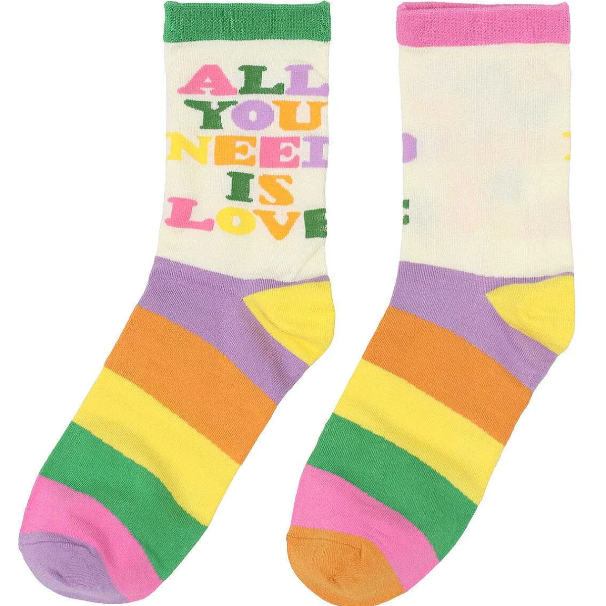 This Colourful Pair Of Socks From House Of Disaster Are Adorned With The Slogan ‘All You Need Is Love’. Featuring The Words From The Song Written In A Bold Uppercase Text In Pink, Green, Lilac, Orange And Yellow, Across The Ankle, Set Against The Cream Background. The Foot Of The Sock Is Adorned With Wide Stripes Which Match The Colours Of The Lettering Creating The Striking Design.
