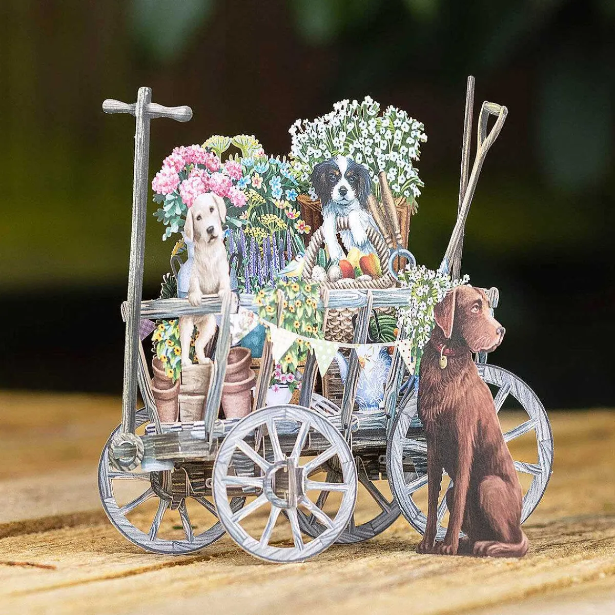 This Pop-Up 3D Card Is Beautifully Designed With Laser Cut, Intricate Details Bringing It To Life. It Depicts An Adorable Scene Of A Group Of Dogs Sat In And Amongst A Cart Full Of Colourful Flowers And Garden Tools! It Is Complete With Small Garden Birds Perched On The Edges Of The Cart.