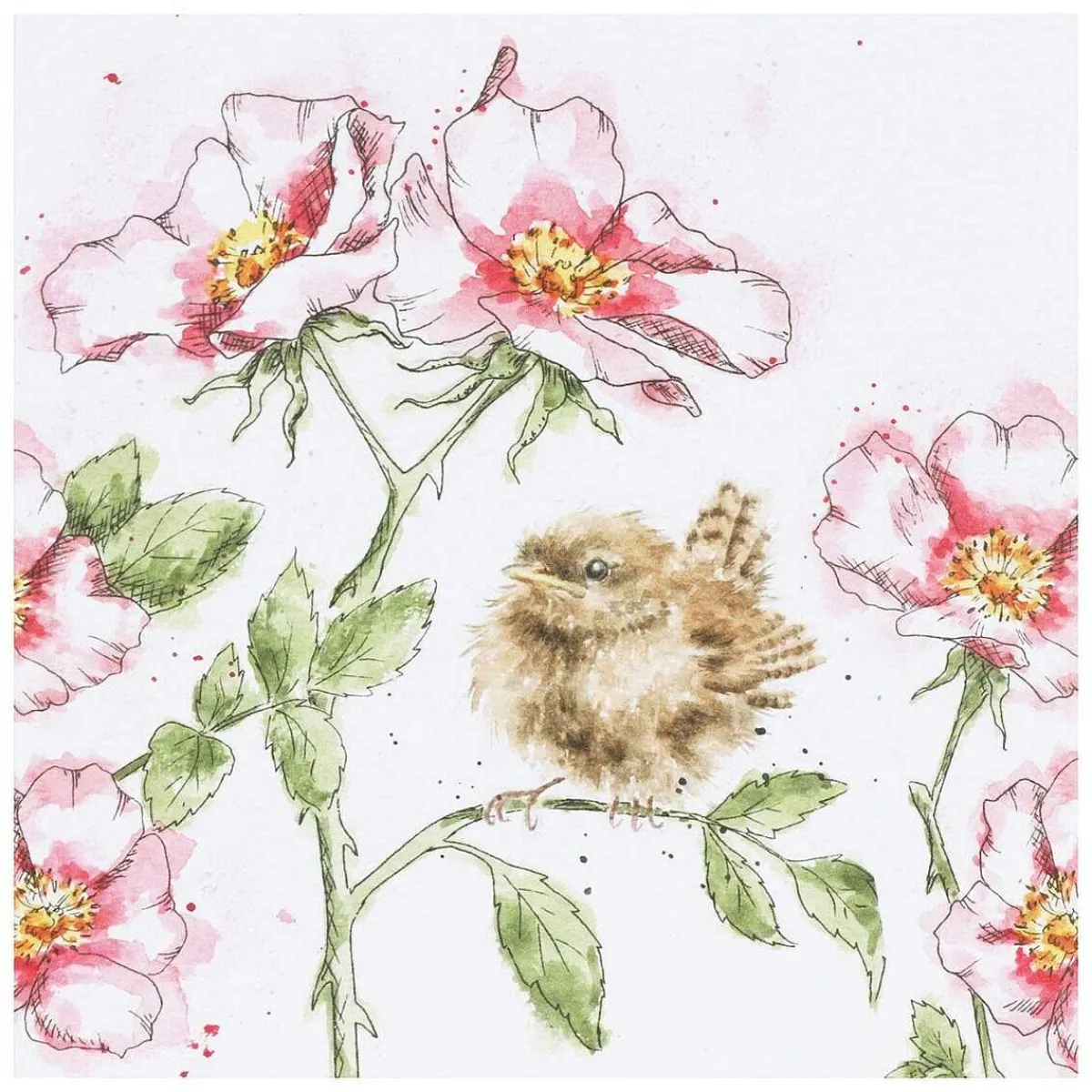 Set Against A Crisp White Background, This Card Features A Gorgeous Illustration Of A Tiny, Scruffy Looking Wren Who Has Perched Amongst A Bunch Of White And Pink Roses. The Design Is Painted In Wonderful Natural Tones In Hannah Dales Signature Style And Surrounding The Design Are Speckles Of Black Paint In A Way That Is Synonymous With Wrendale Designs.