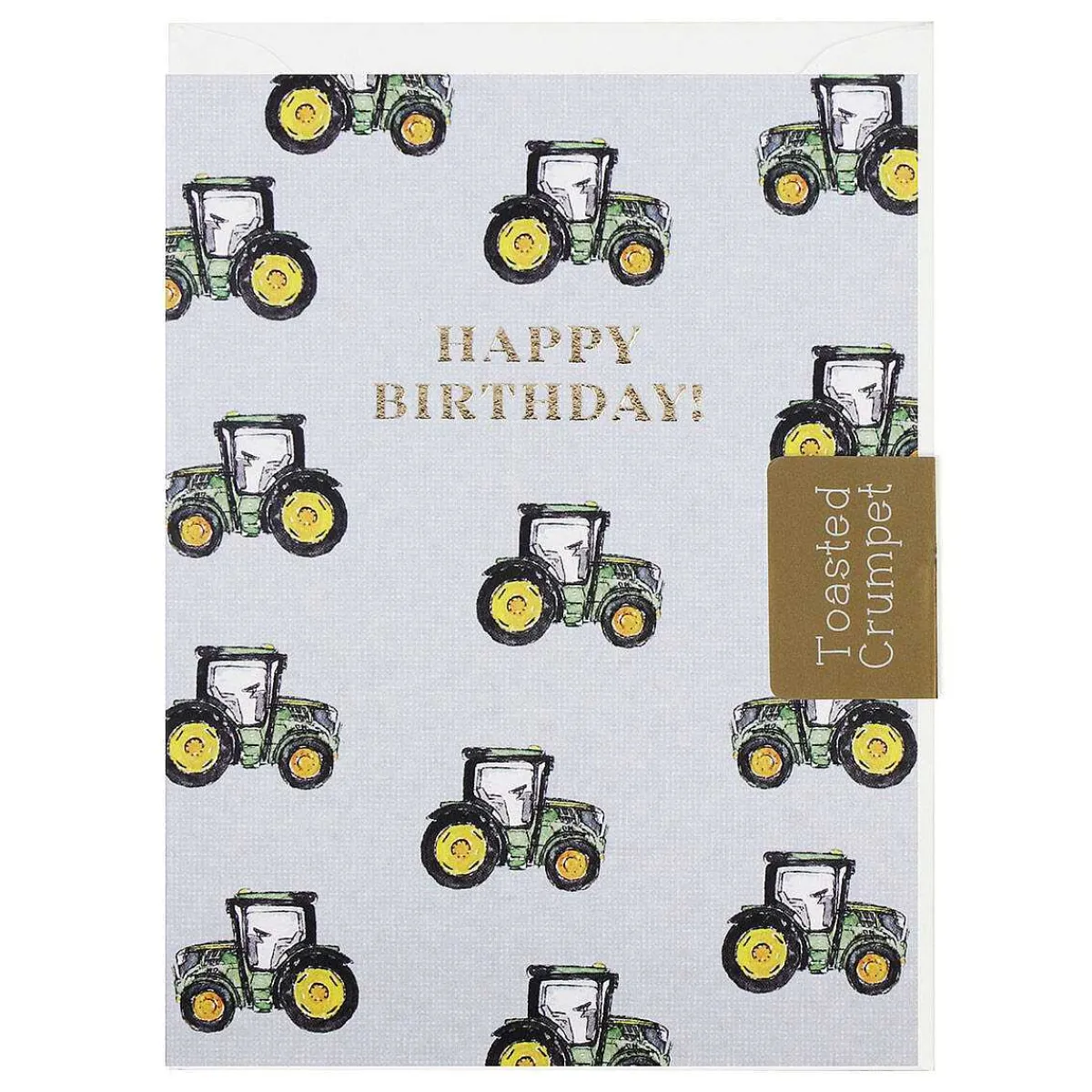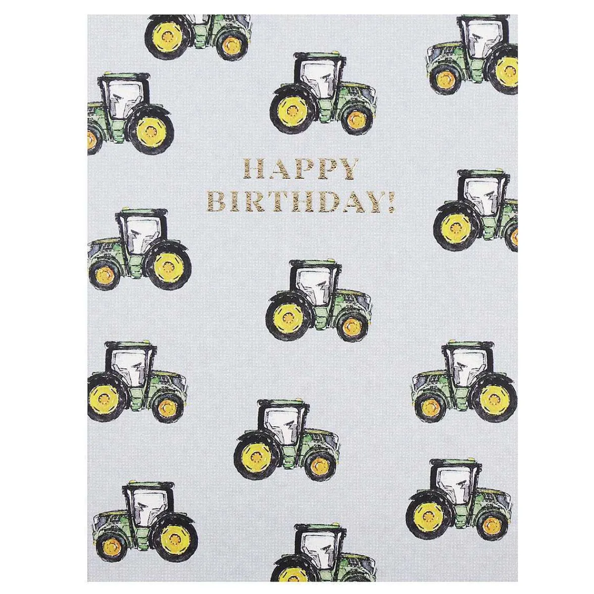 The Front Of This Card Is Decorated With Charming Watercolour Illustrations Of Green Tractors In A Scatter Pattern, Set Against A Mottled Grey Background. The Words ‘Happy Birthday!’ Are Debossed In Metallic Gold Text That Shimmers And Sparkles.