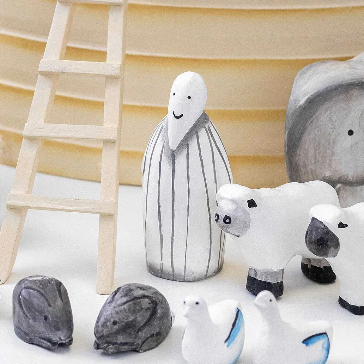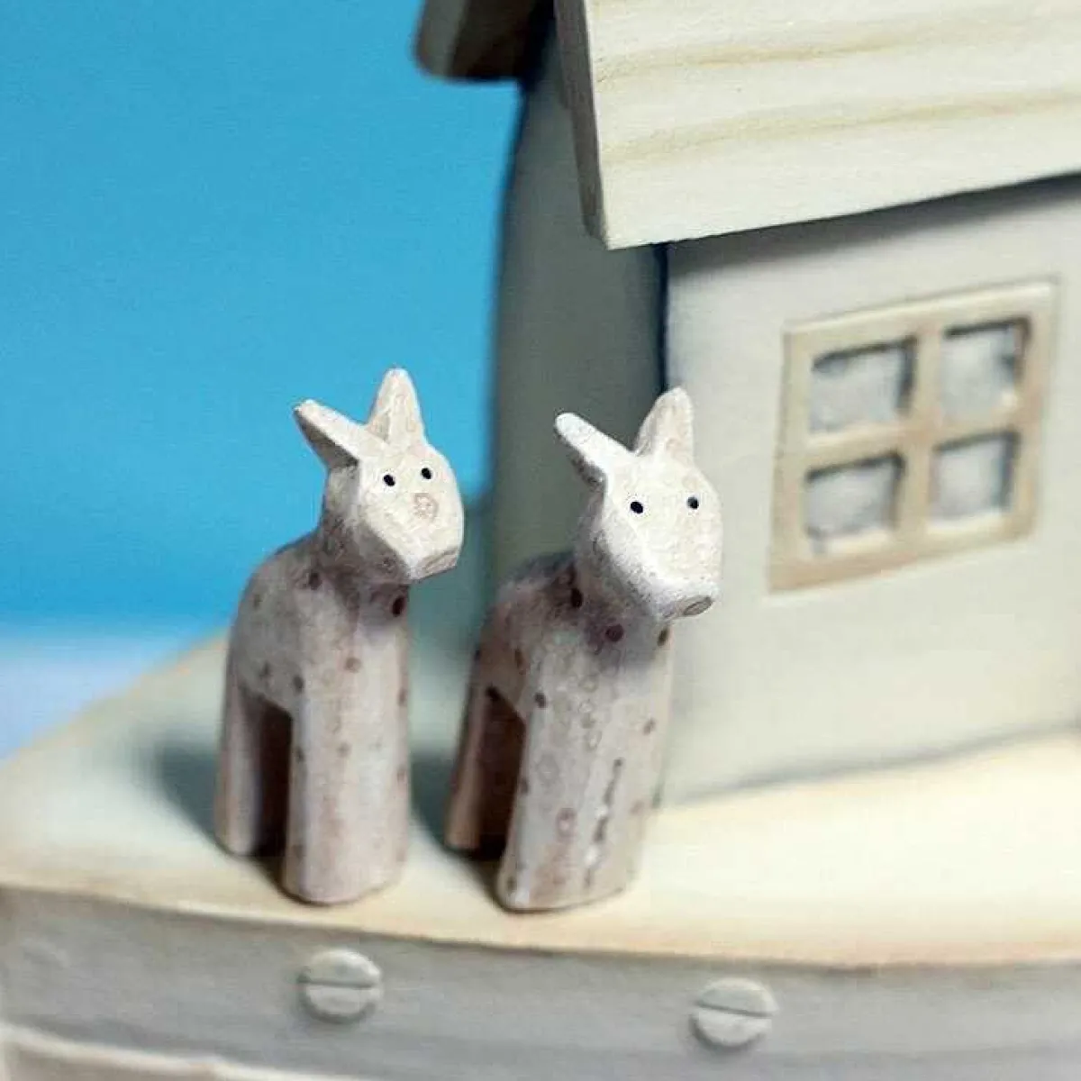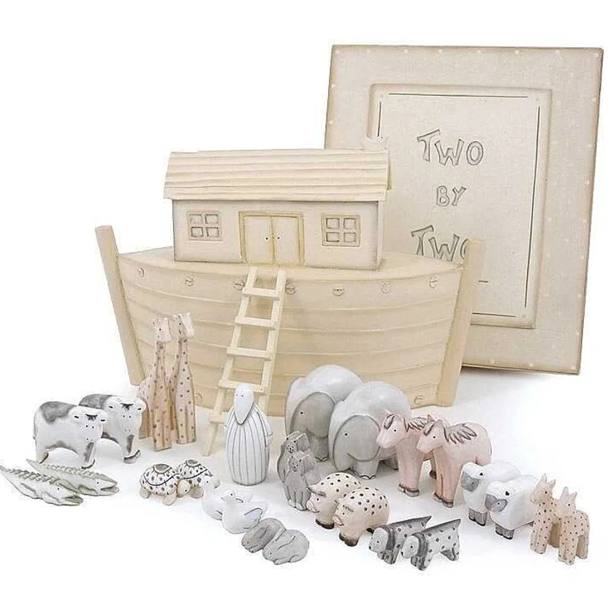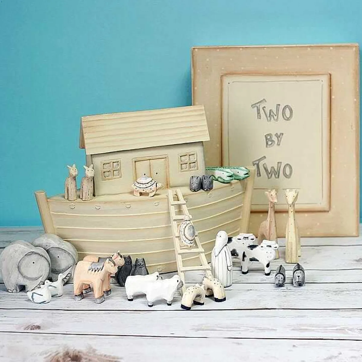 The Wooden Box Which Accompanies The Ark Is Painted In Matching Soft Tones Of Cream And Ochre, The Lid Fits Snugly And Has A Pattern Of Pale Polka Dots And A Cream-Painted Plaque, Which Is Carved With The Words Two By Two And A Tiny Heart. The Lid Lifts Off To Reveal A Partitioned Interior, With Shredded Brown Paper To Emulate The Straw Which The Animals Are Using For Bedding. There Are Elephants, Giraffes, Cows, Leopards, Geese, Pigs, Cats And Crocodiles, Turtles, Sheep And Horses, All Nestled Together And All Carved And Painted In An Endearing Naïve Style With Soft Colours And Simple Contours. Noah Himself Is Carved With The Simplicity Of A Nordic Sculpture, With A Pointed Beard And A Hint Of Indentation Suggesting A Moustache, Above Which Two Dots For Eyes Give Him A Slightly Bemused Expression. The Final Piece Is A Primitive A-Frame Ladder, By Which The Animal Passengers Enter The Ark, Two By Two.