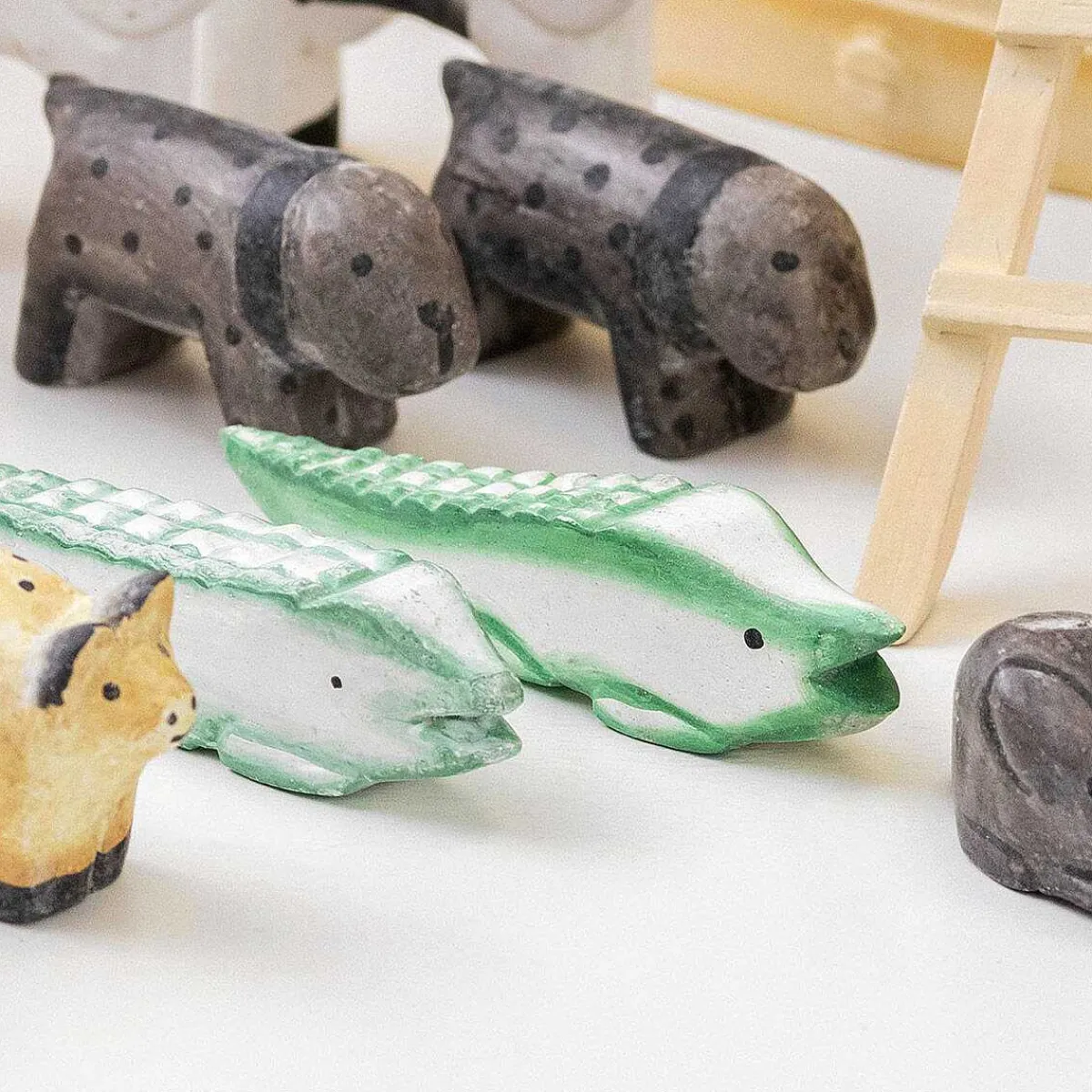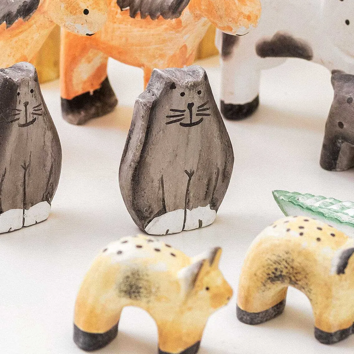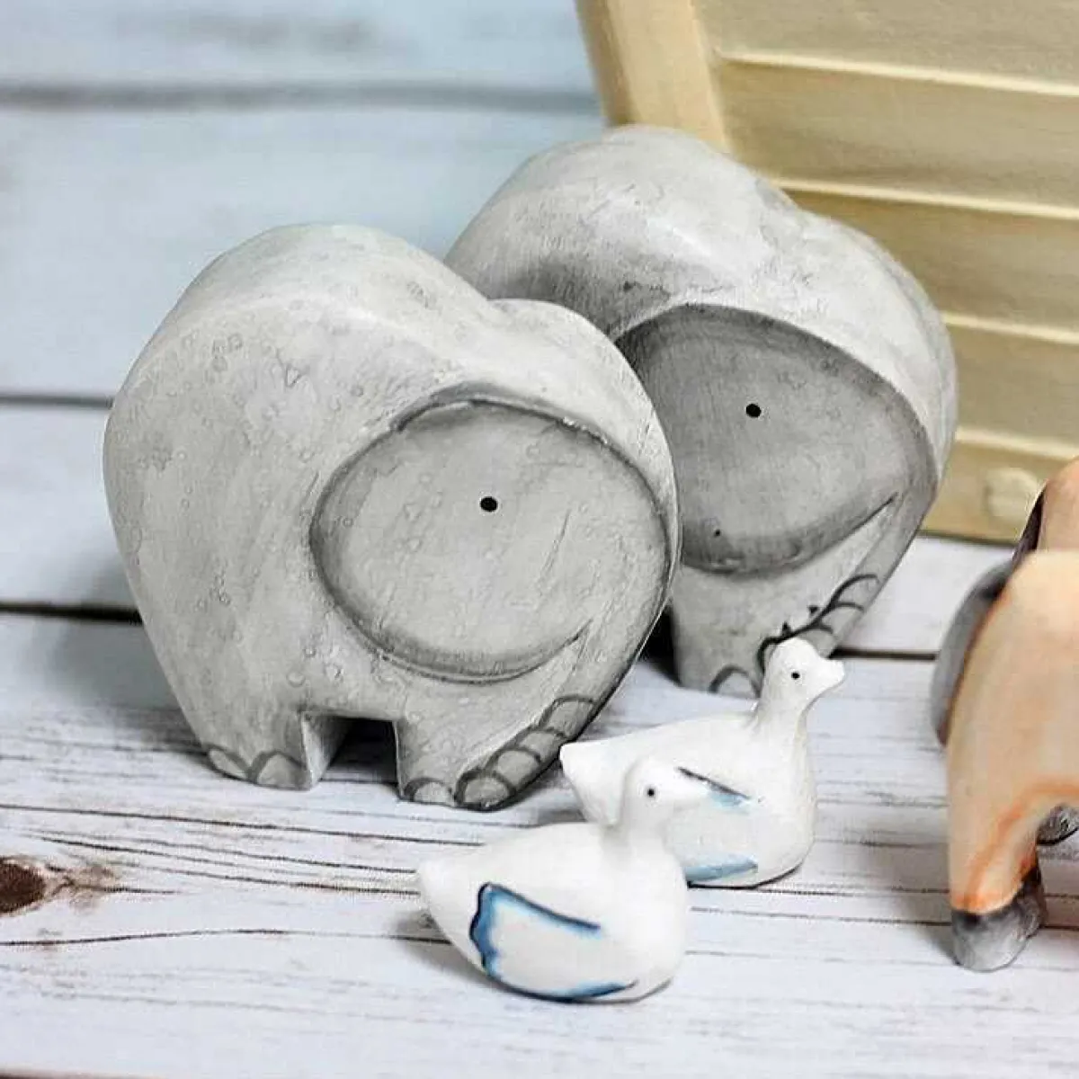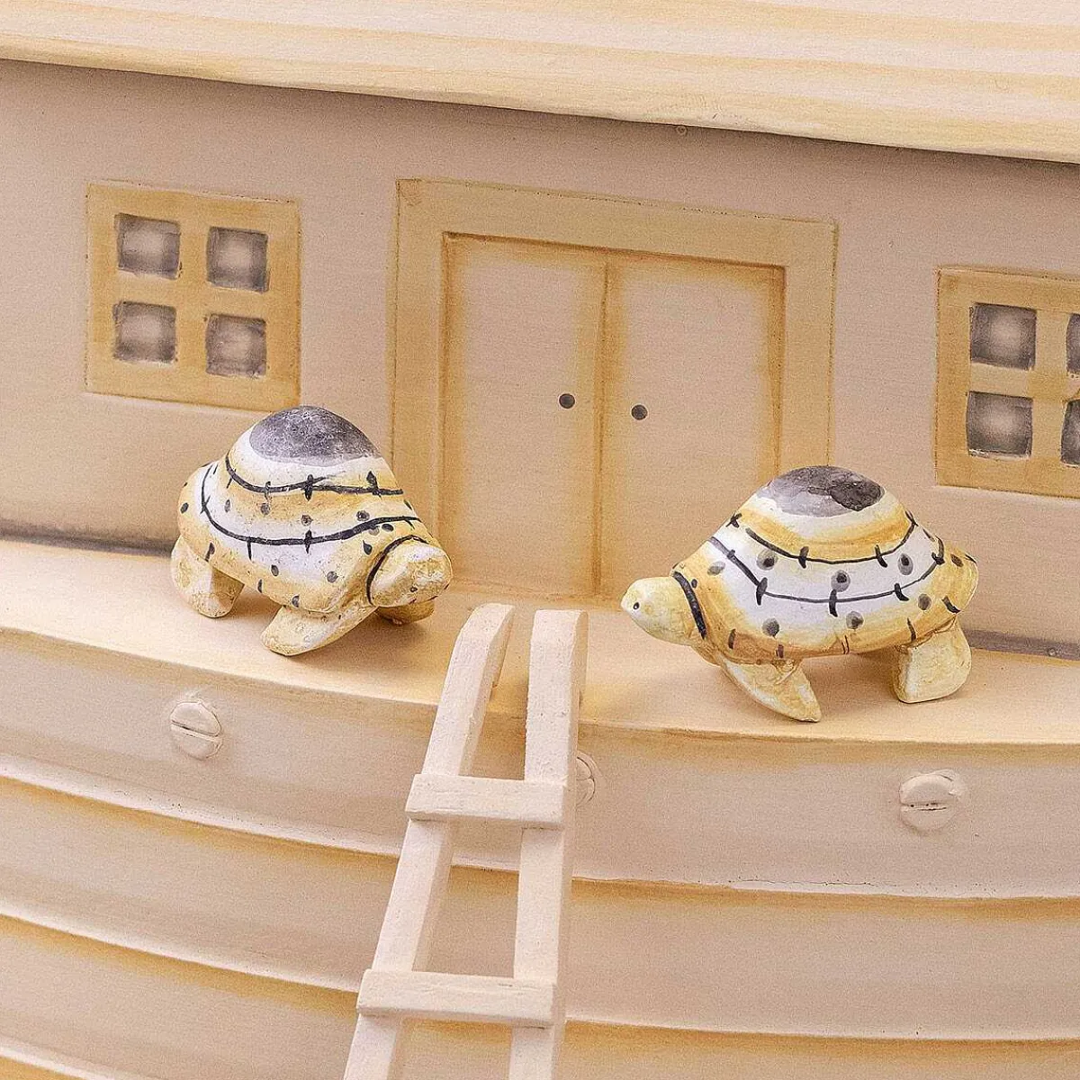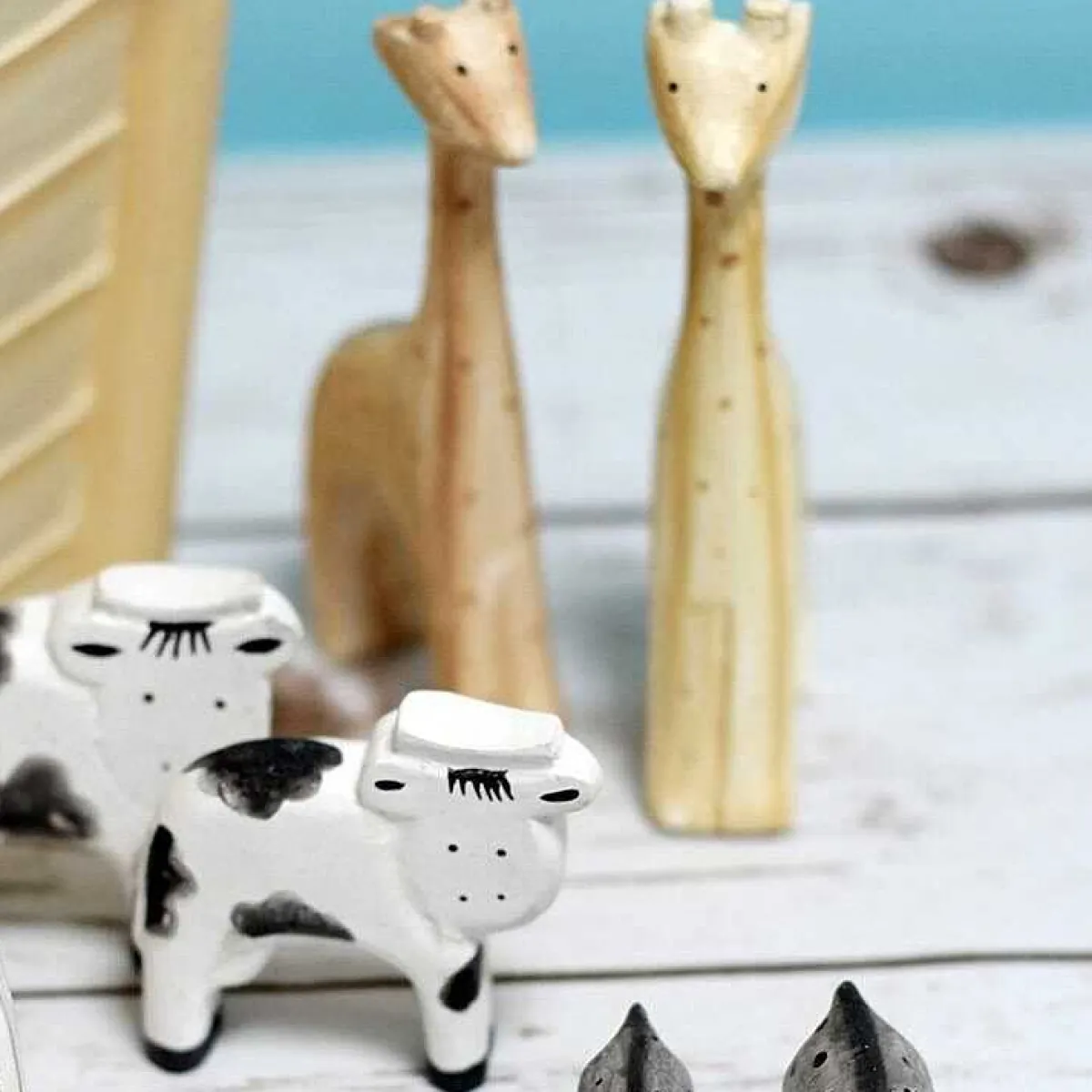The Wooden Box Which Accompanies The Ark Is Painted In Matching Soft Tones Of Cream And Ochre, The Lid Fits Snugly And Has A Pattern Of Pale Polka Dots And A Cream-Painted Plaque, Which Is Carved With The Words Two By Two And A Tiny Heart. The Lid Lifts Off To Reveal A Partitioned Interior, With Shredded Brown Paper To Emulate The Straw Which The Animals Are Using For Bedding. There Are Elephants, Giraffes, Cows, Leopards, Geese, Pigs, Cats And Crocodiles, Turtles, Sheep And Horses, All Nestled Together And All Carved And Painted In An Endearing Naïve Style With Soft Colours And Simple Contours. Noah Himself Is Carved With The Simplicity Of A Nordic Sculpture, With A Pointed Beard And A Hint Of Indentation Suggesting A Moustache, Above Which Two Dots For Eyes Give Him A Slightly Bemused Expression. The Final Piece Is A Primitive A-Frame Ladder, By Which The Animal Passengers Enter The Ark, Two By Two.