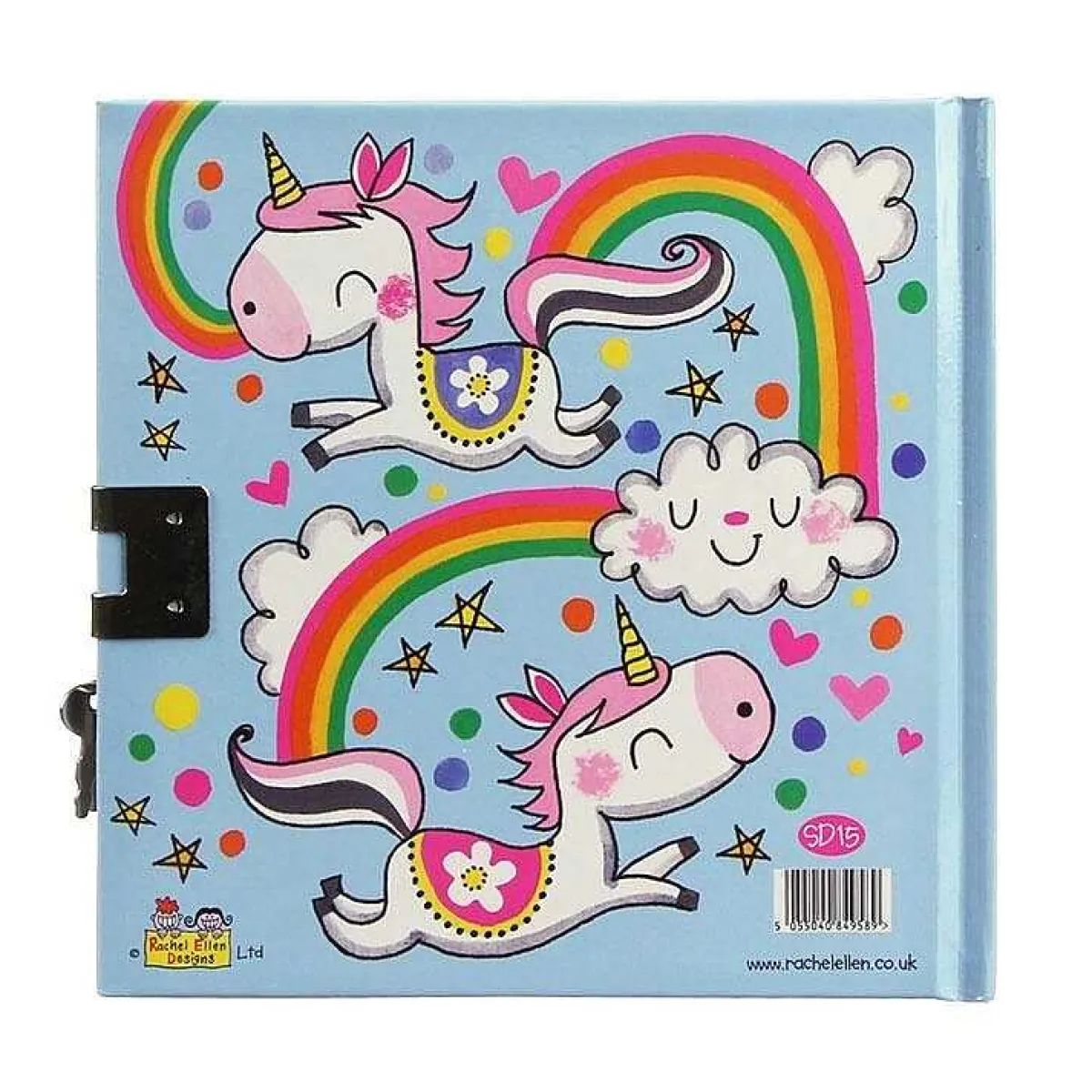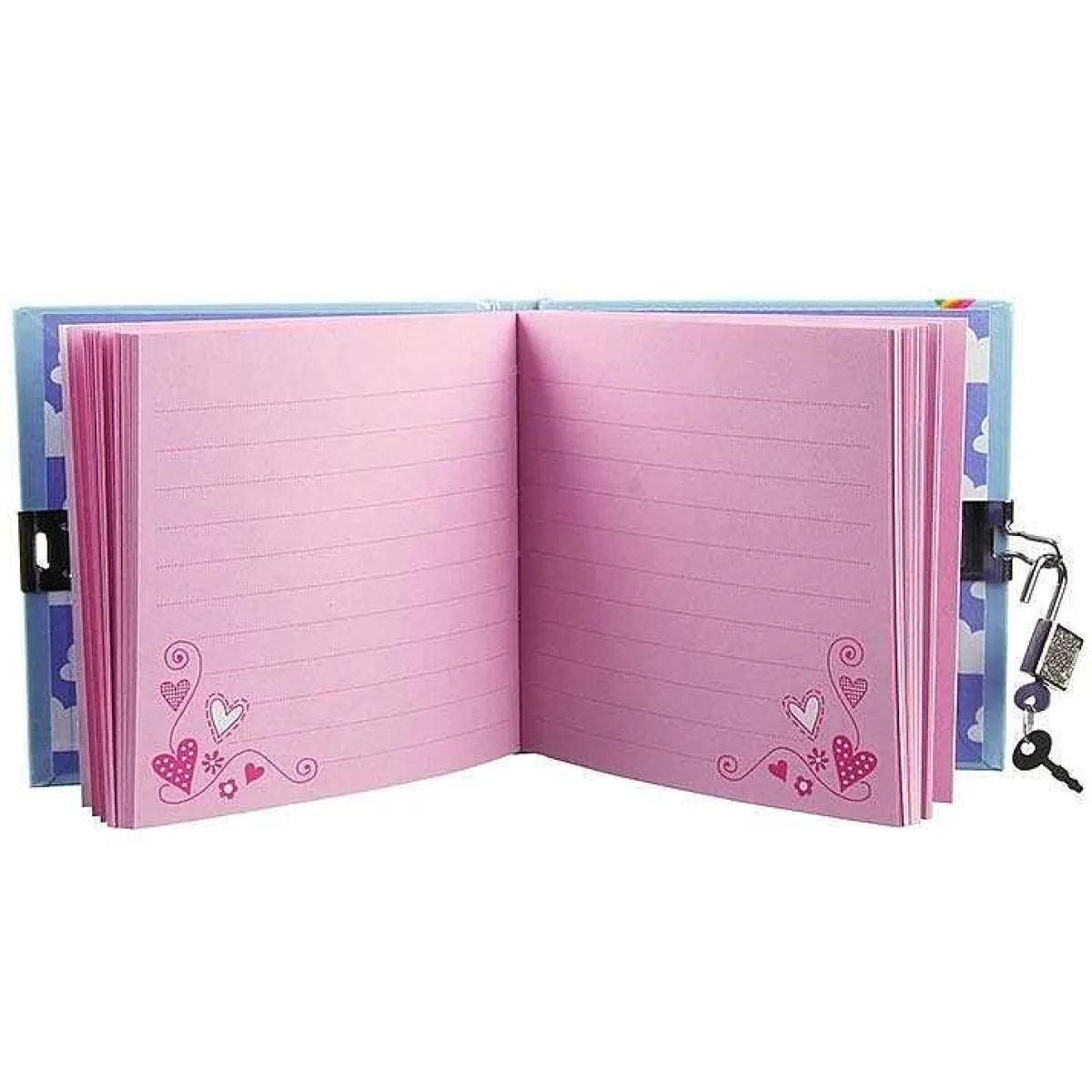 Printed On A Pale Blue Background, A Mystical Unicorn Leaps Over A Rainbow With Her Bird Friends In Tow And Smiley Clouds All Around! The Design Features Glitter Details Making For An Extra Magical Diary! The Lined Pages Inside Are Pale Pink With A Small Illustration Of Hearts And Flowers In The Corner. The Little Padlock Secures The Diary And Comes With Two Keys, Just In Case You Lose One!