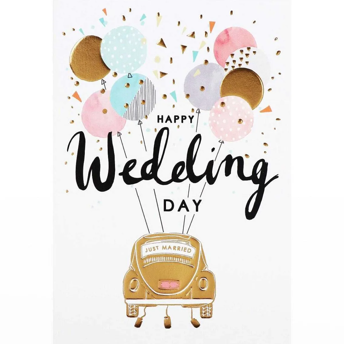 Set Against A Crisp White Background, This Card Features A Delightful Illustration Of A Gold Vintage Car Which Has The Text ‘Just Married’ Printed Of The Rear Window. Attached To The Top Of The Car Is A Variety Of Colourful, Patterned Balloons, Surrounded By Falling Confetti, And In The Centre Of The Card Is The Text ‘Happy Wedding Day’ Which Has Been Written In A Cursive, Black Font.