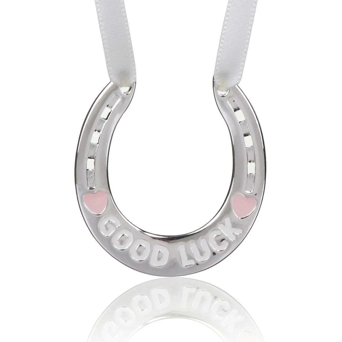 Complete Your Wedding Outfit With This Beautiful Decorative Lucky Horseshoe Especially Designed For The Bride Or Bridesmaid To Carry. This Wedding Keepsake Features A Sleek Silver Horseshoe With The Words ‘Good Luck’ Debossed Onto It Along With Two Pink Hearts. The Horseshoe Is Threaded Onto A Piece Of Cream Ribbon Which Can Be Tied At Any Length.
