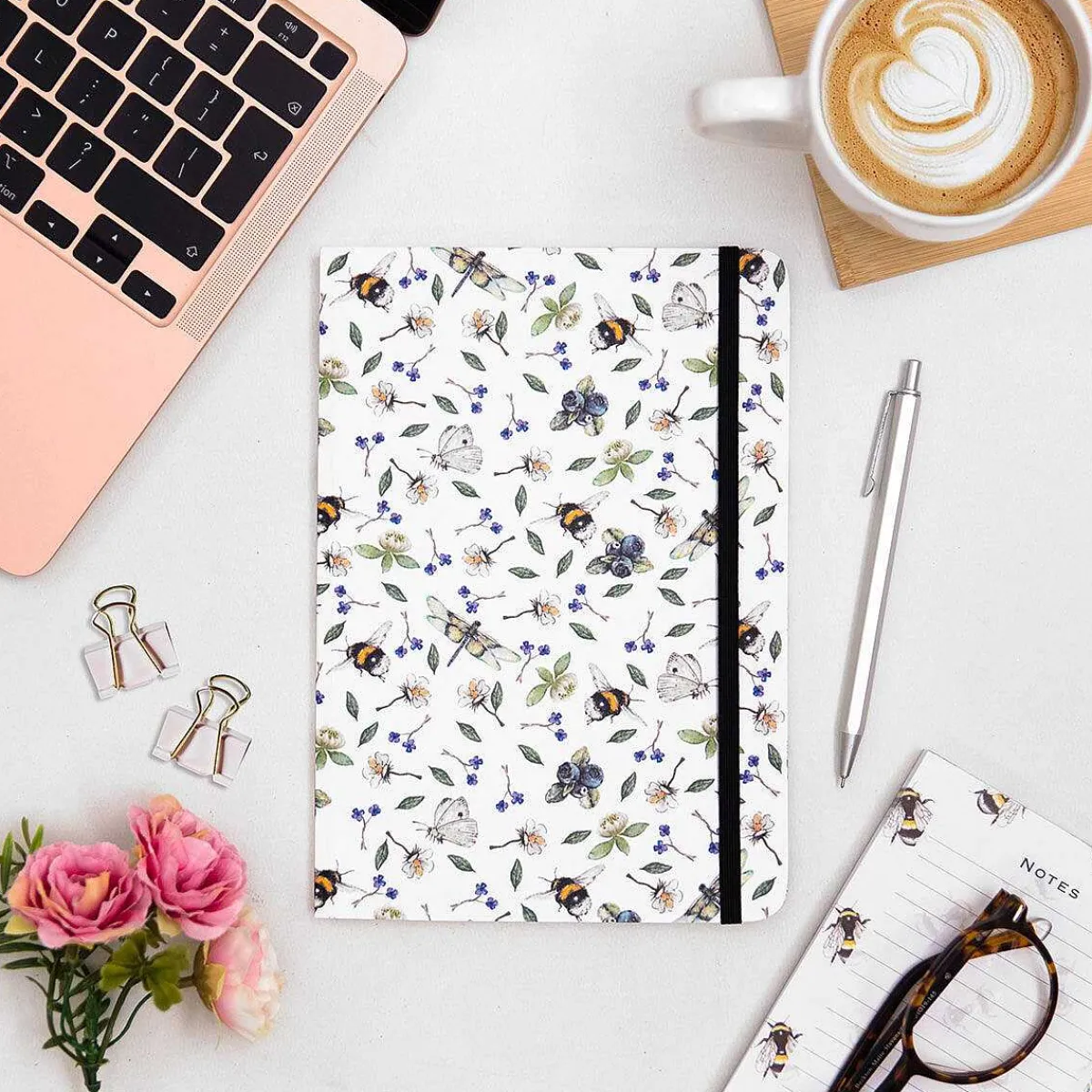The Front Cover Of This Stylish Notebook Features A Pattern Of Bumblebees And Butterflies That Are Punctuated By Wildflowers, Which Have Been Depicted In Glorious Watercolour On A White Background.