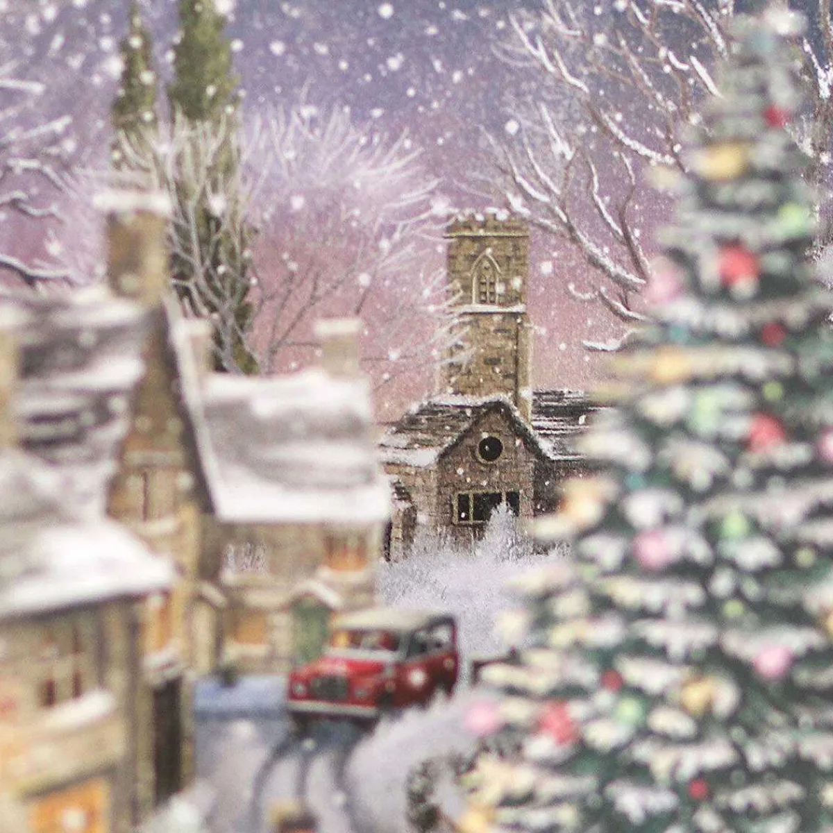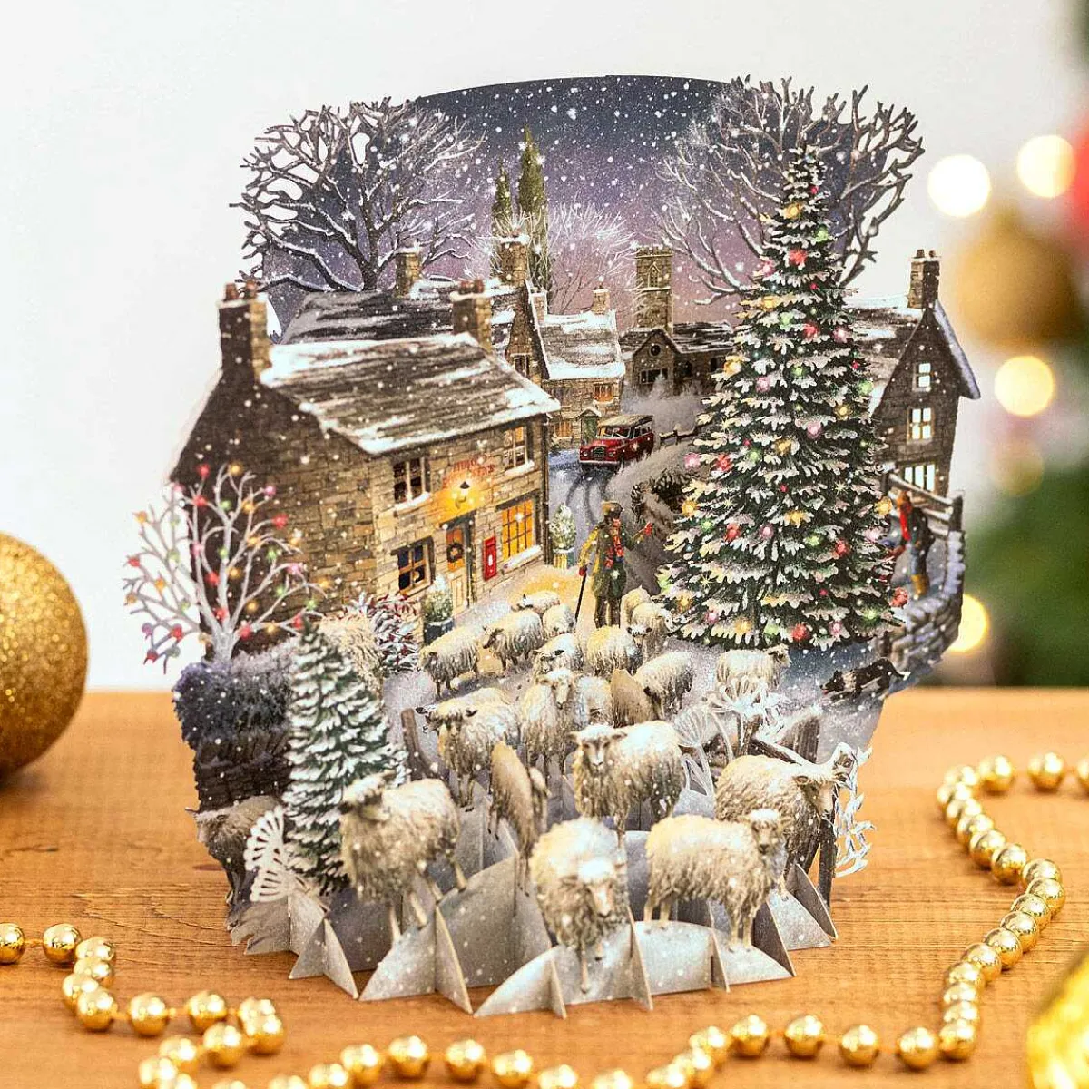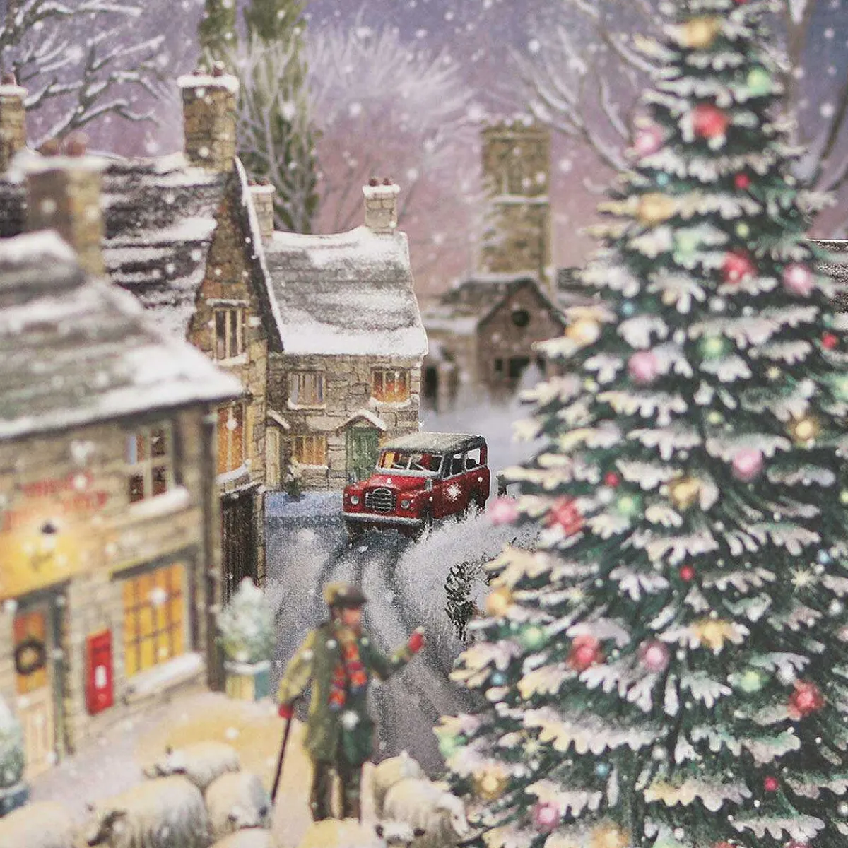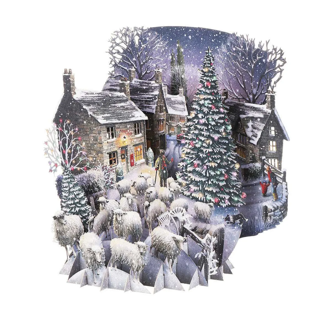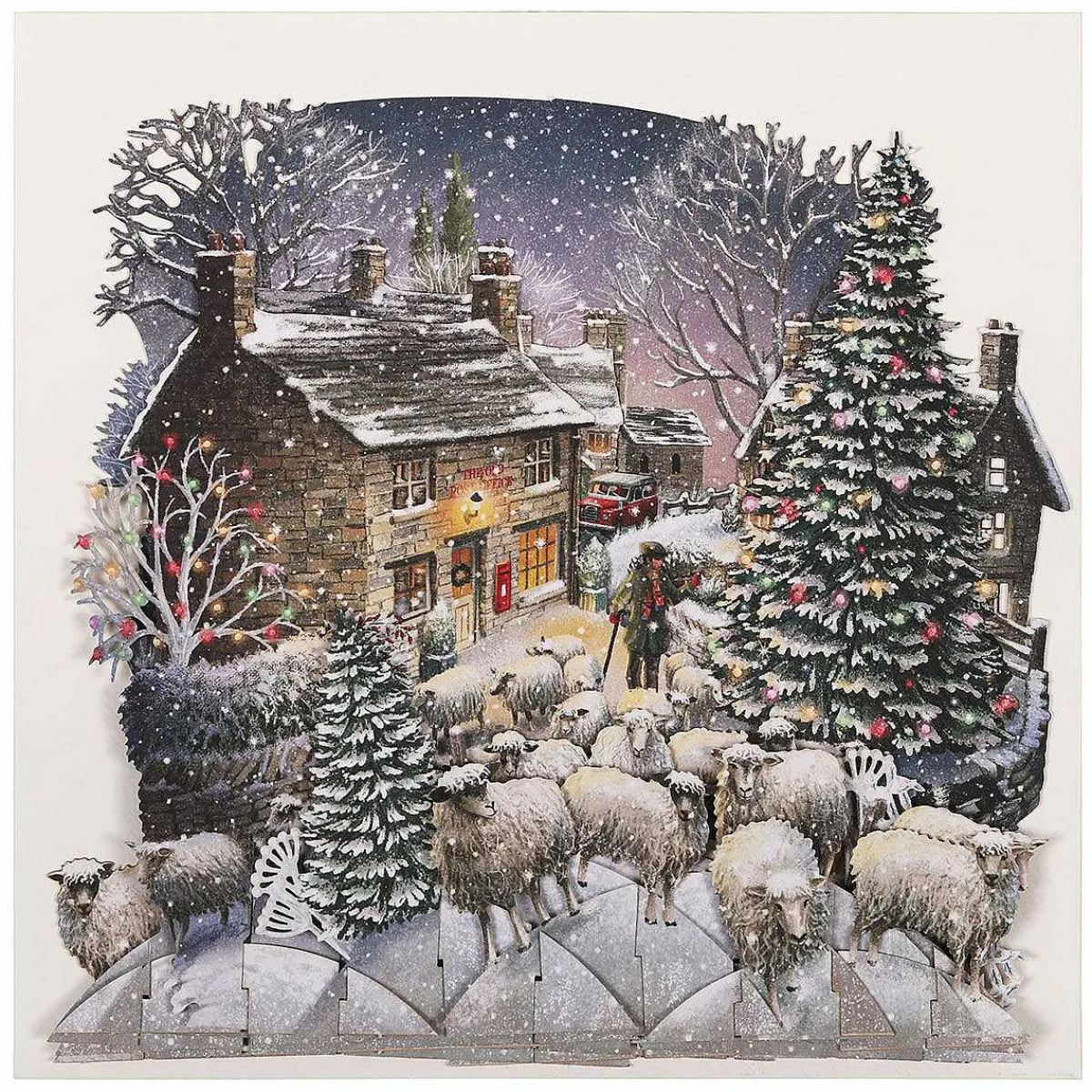 The Intricate Design Features A Snowy Village At Night-Time With A Post Office And Other Brick Cottages And Snow-Covered Trees. Passing Through The Village Is A Flock Of Fluffy Sheep Being Directed By A Shepard And A Sheep Dog.