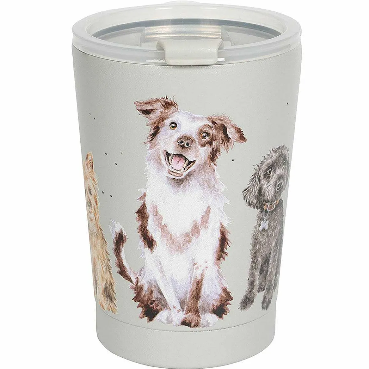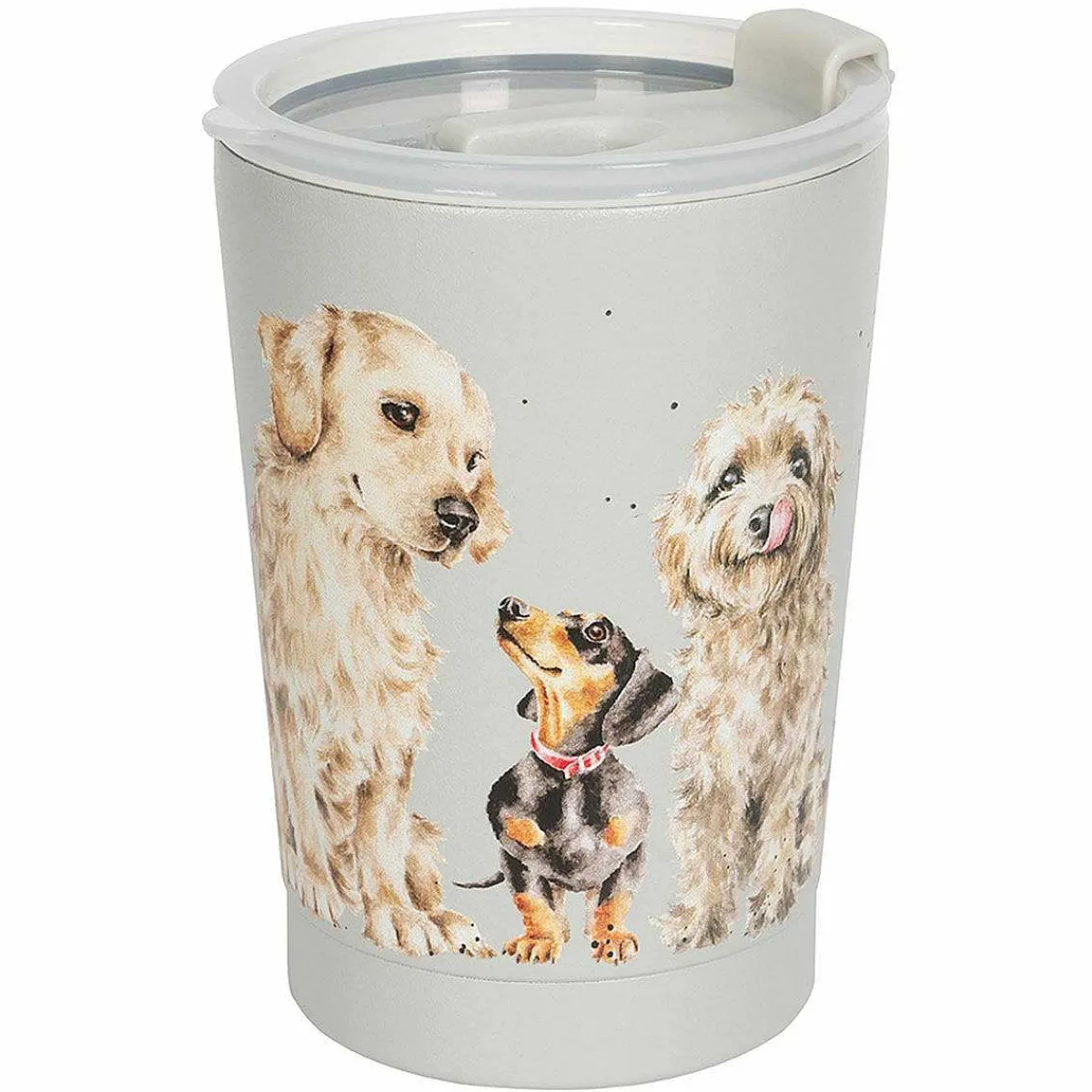 Made From Stainless Steel, This Travel Cup Is Decorated With The ‘A Dog’s Life’ Illustration By Hannah Dale. It Depicts A Group Of Dogs Of Various Breeds Including A Border Collie, Dachshund, Golden Retriever, A Cockapoo And More. The Dogs Are Shown Sat Waiting Around The Whole Cup And Are Set Against A Gorgeous Warm Grey Background. The Design Is Surrounded By Speckles Of Black Paint To Give The Classic Look That Is Synonymous With Wrendale Designs.
