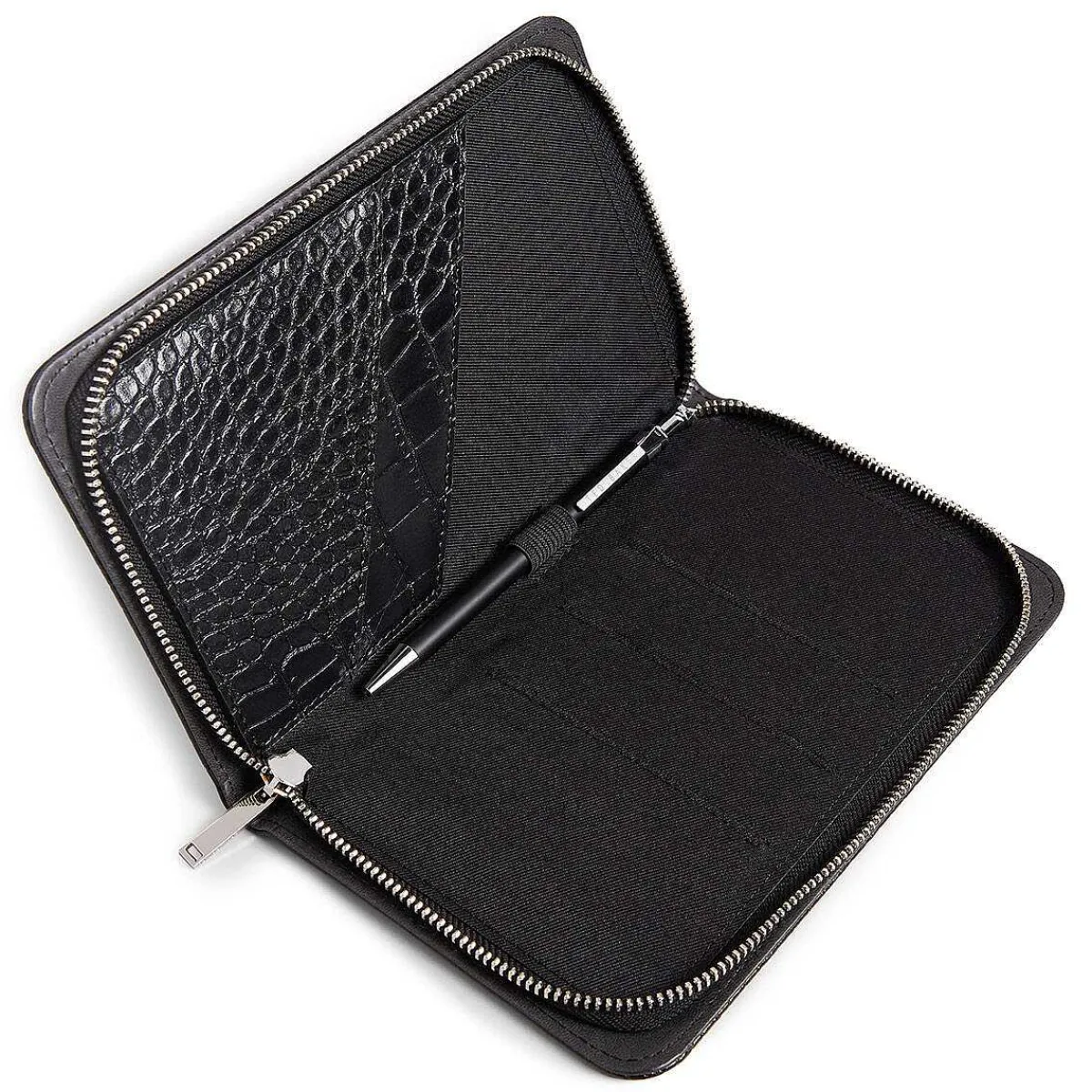 This Sleek Black Wallet Is Designed With Travelling In Mind, And It Is Complete With Three Slots And Two Pockets That Are Perfect For Storing Passports, Boarding Passes, And Other Useful Documents. As Well As The Separate Compartments, This Organiser Comes With A Black Pen With Silver Accents, So That You’Re Never Caught Without A Pen When Filling In Paperwork. The Exterior Of The Wallet Is Embossed With Black Crocodile Scales, And Your Contents Is Kept Secure With A Silver Zip Fastener. The Interior Features A Soft Black Lining, With Two Of The Pockets Embossed With A Matching Croc-Effect Motif.