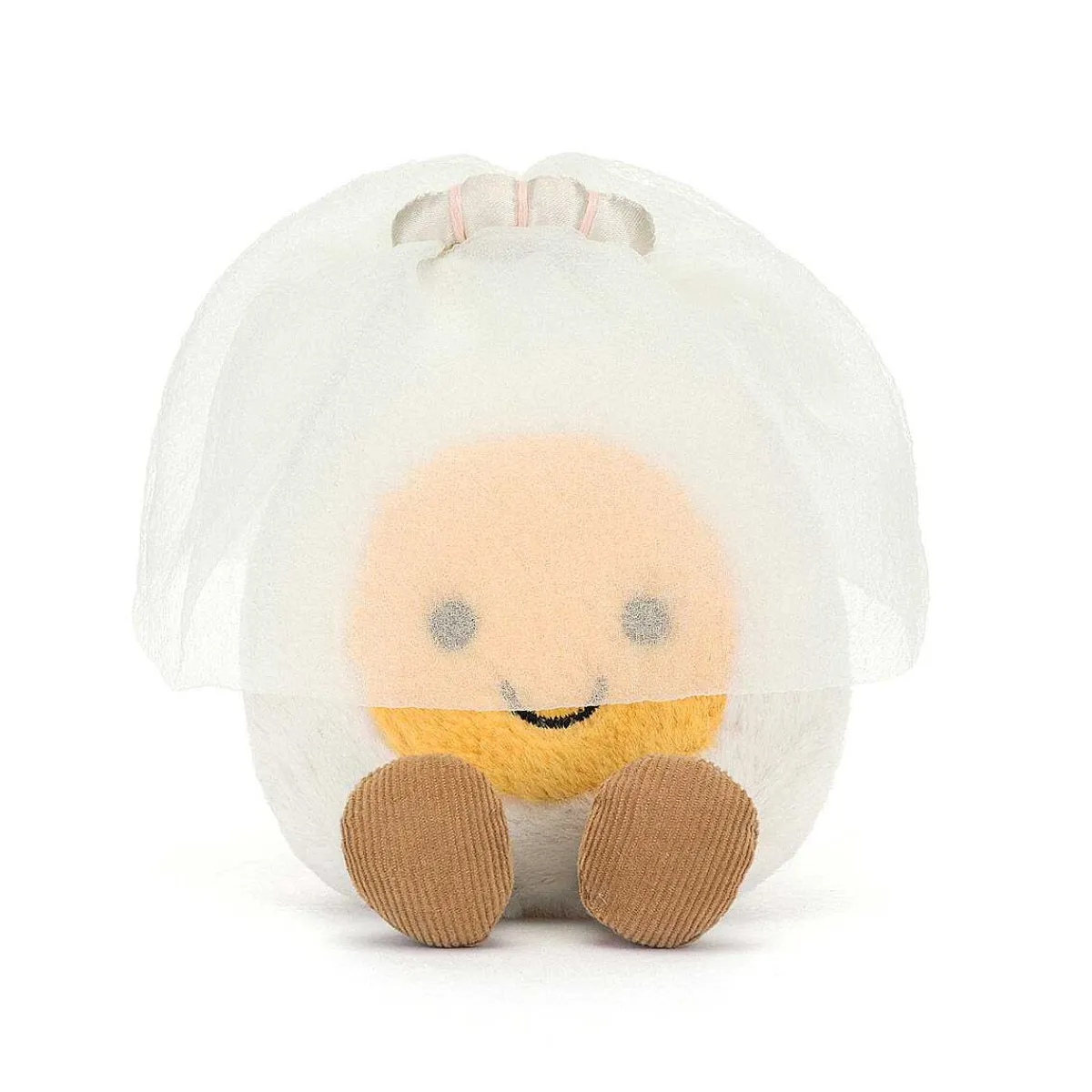 This Cheery Little Egg Has A Squishy, Fluffy White Body And Bright Sunshine Yellow Face With A Cheeky Eggspression, And Brown Corduroy Legs Poking Out From Under Her. She Wears A White Transparent Bridal Veil On Her Head Which Covers Her Face. She Has Been Perfectly Boiled And Is All Set To Become Your Number One Cuddle Companion – Ready For Many An Adventure!