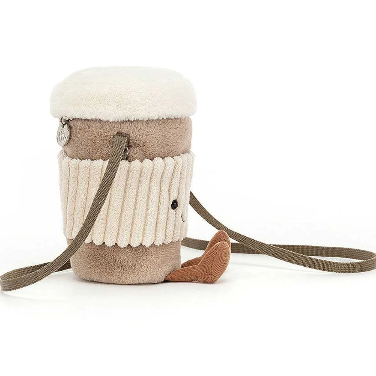 Super Soft, This ‘Caffeine Filled’ Friend Is Shaped Like A Takeaway Cup With A Wide Cream Corduroy Band And A Fluffy White Lid! Hanging From The Bottom Are Little Brown Corduroy Legs Which Jump Around As You Walk. Featuring A Shoulder Strap For Carrying And A Zip Fastening Across The Top To Secure Your Things, This Amuseable Coffee-To-Go Bag Is A Fun Bag For Keeping All Your Goodies Together Wherever You Go!