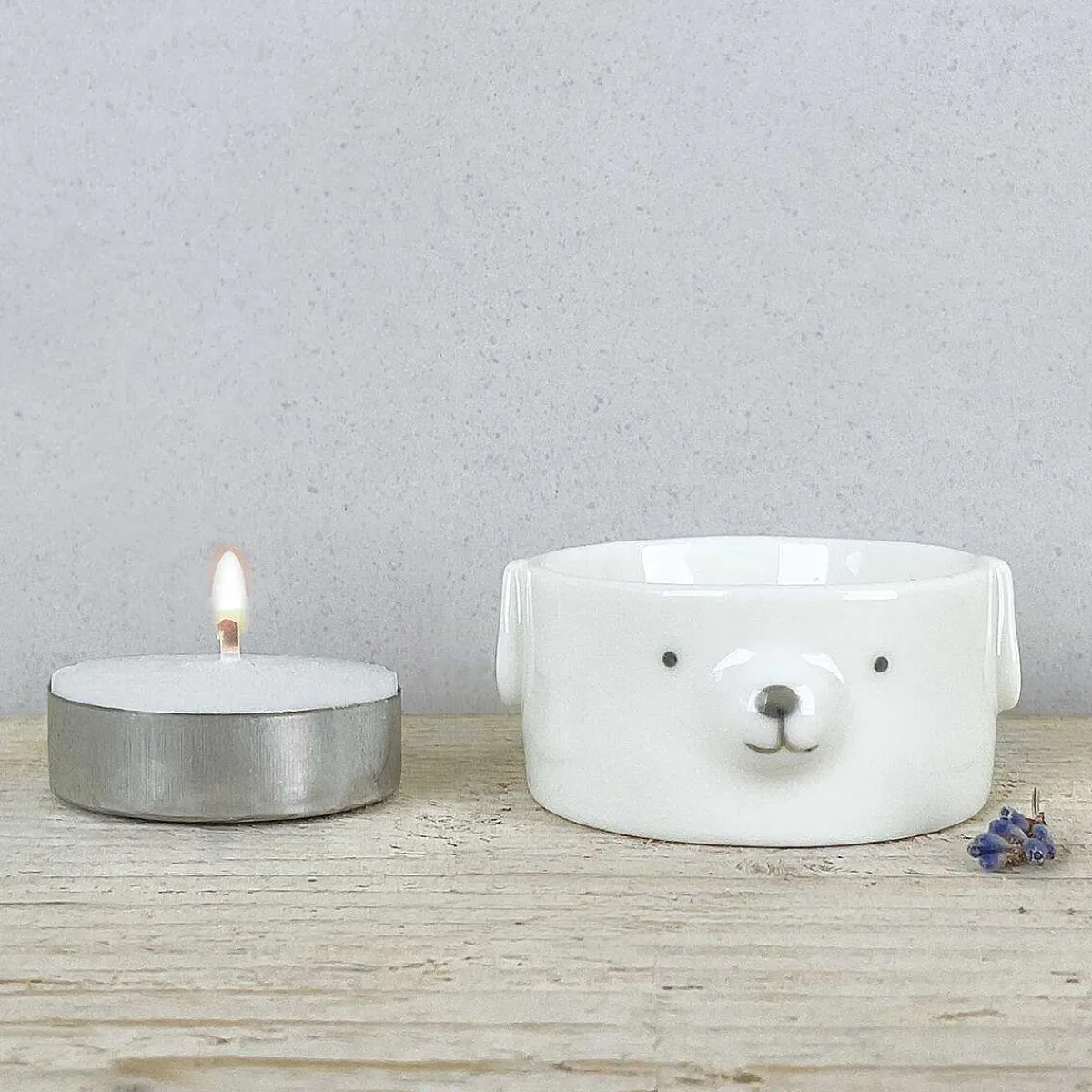 Made From Ceramic This White Coloured Candle Holder Features A Dogs Face With Small Eyes And Nose With Long Floppy Ears At The Side. It Is Presented In A Beige Coloured Box Which Is Decorated With The Same Design That Is On The Candle.