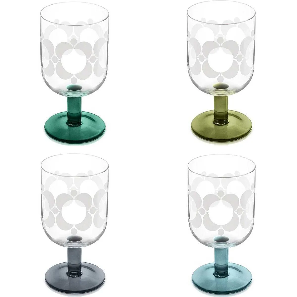 The Glasses Are Adorned With Four-Petal Flowers In A Frosted White Colour Set Against The Clear Glass Body. The Four Different Glasses Each Have A Different Shade Of Green Coloured Stem Ranging From A Deep Rich Green To Bottle Green, Teal Blue And Teal Green. Each Wine Glass Holds 300Ml Of Liquid Allowing You To Enjoy Your Wine Of Choice.
