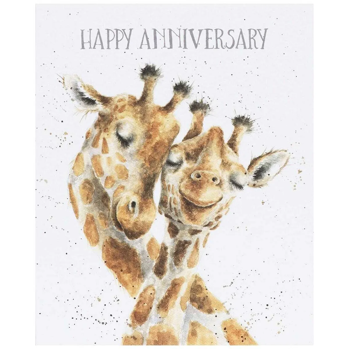 Depicted On The Front Of This Card Is A Wonderful Illustration Of A Pair Of Giraffes, Set Against A Crisp White Background. The Giraffes Are Lovingly Nuzzling Against Each Other, Both With Big Smiles On Their Faces. The Illustration Is Surrounded By Black Speckles Of Paint That Is Synonymous With The Wrendale Brand. The Design Is Delicately Painted With Soft, Intricately Detailed Brushwork And Subtle Watercolours. Around The Illustration On The Front Of This Card Is Text That Reads;