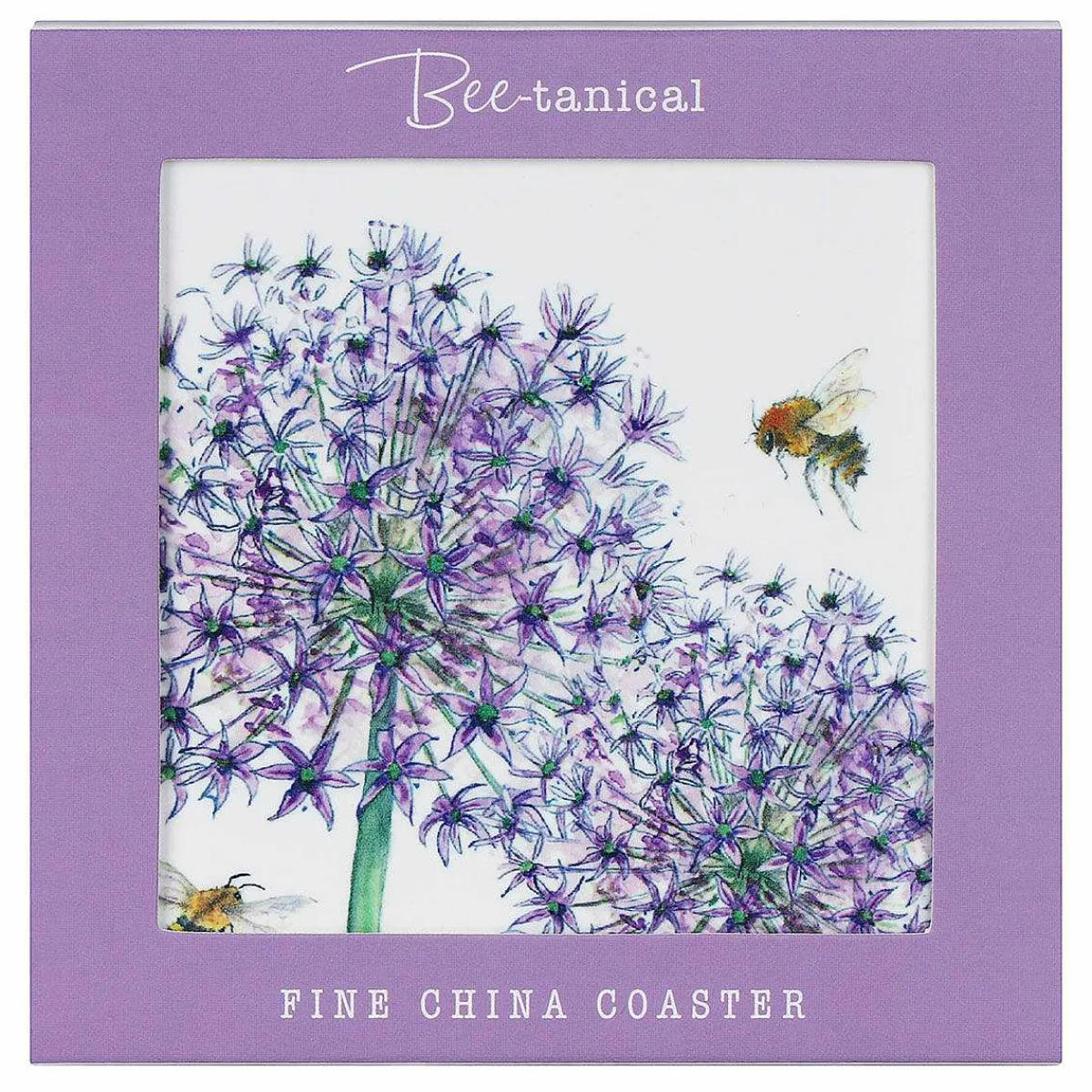This Square Coaster Features A Stunning Watercolour Illustration Which Depicts Two Large Allium Flowers, In Shades Of Purple With Green Stems And A Few Bees Buzzing Around In Interest Of Pollen. The Gorgeous Motif Is Depicted With Wonderful Detail And Stands Out Against The Crisp White Ceramic Background, Making It Simply Beautiful.