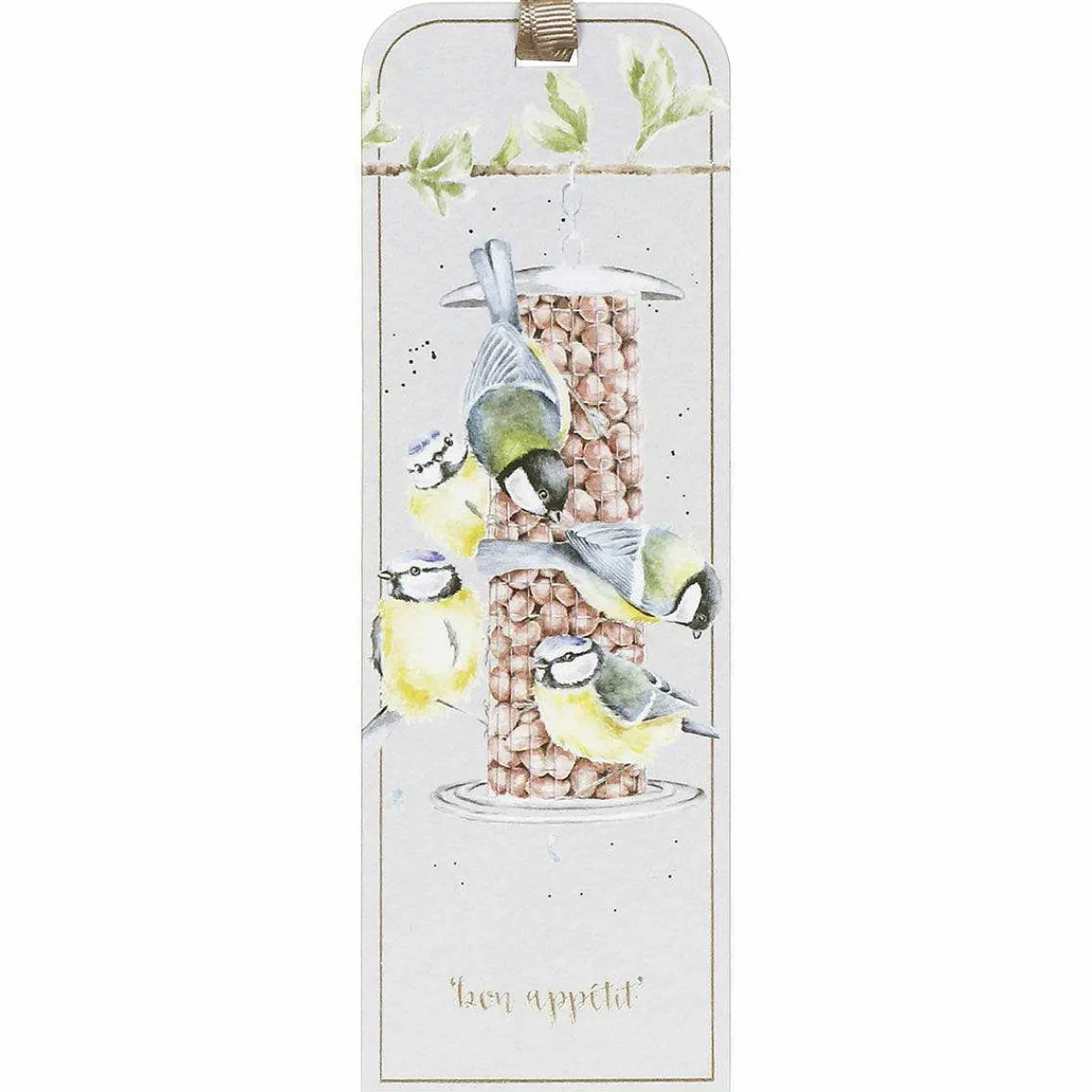 Made From Extra Thick Card, This Bookmark Is Pale Grey In Colour And Features A Beautiful Illustration Of A Bird Feeder Hanging From A Branch Filled With Bird Food. Surrounding The Feeder Is A Flock Of Garden Birds Including Blue Tits And Great Tits All Trying To Get A Quick Snack! The Design Is Painted In The Soft Watercolour Style Of Artist Hannah Dale, Depicted With Intricate Detail And Surrounding The Illustration Are Speckles Of Black Paint, In A Way That Is Synonymous With The Wrendale Brand. Written Underneath The Illustration Are The Words ‘Bon Appétit’ Which Is The Name Of The Design. This Has Been Gold Foiled To Add A Touch Of Luxury To The Design. On The Reverse Of The Bookmark Is Some Insightful Information About The Animal And At The Top Is A Piece Of Ribbon.