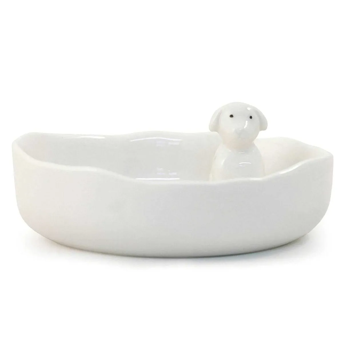 The White Porcelain Dish Features A Flowing ‘Wobbly’ Rim And Features The Intriguing Design Of A Three-Dimensional Dog Inside The Dish. The Interior Is Decorated With Dainty Black Polka Dots As Well As The Loving Words; ‘Bonjour’.