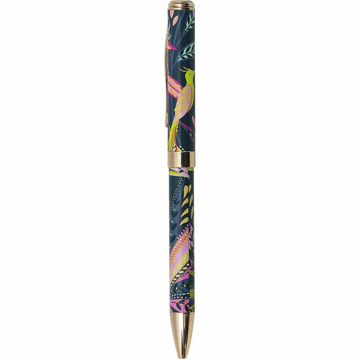 The Stylish Pen Is Beautifully Decorated With The Botanic Paradise Design Featuring A Plethora Of Decorative Leaves In Shades Of Lime, Pinks And Blues, Set Against A Petrol Blue Background. The Design Is Complete With A Magnificent Single Bird. The Gold Detailing Will Add A Touch Of Luxury To Your Stationery Collection.
