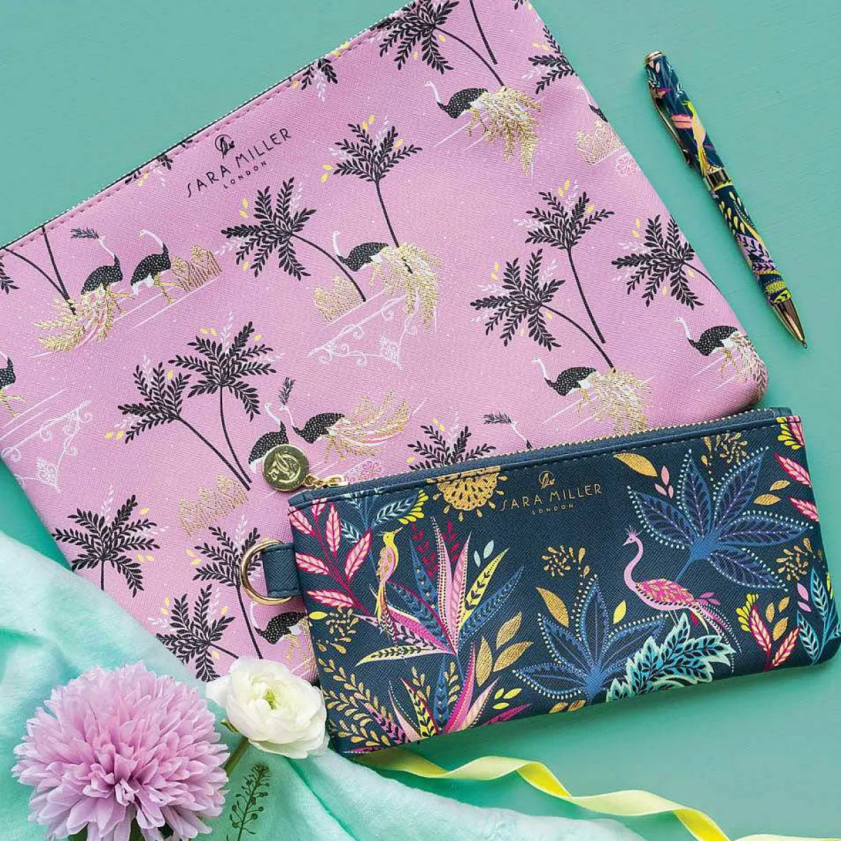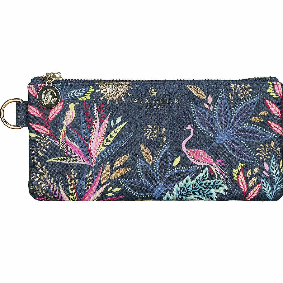 This Gorgeous Small Pouch Features The Stunning Botanic Paradise Design, A Part Of The Savannah Collection. The Design Depicts A Plethora Of Foliage In A Multitude Of Patterns Captures In Blues, Pinks And Yellow. This Is All Set Against A Petrol Blue Background. The Pattern Showcases A Couple Of Majestic Birds And Is Finished With Gold Foil Detailing Which Adds A Touch Of Luxury To The Design. The Pouch Is Made From Faux Leather And Has A Cross Hatched Textured Finish. The Sophisticated Pencil Pouch Is Finished With A Golden Zip With The Sara Miller Emblem. On The Side Of The Pouch Is A D Ring For You To Attach A Charm Of Your Choice Or You Could Attach A Clutch Bag Wrist Strap. The Lining Inside This Pencil Case Is Pale Pink Which Contrasts With The Exterior Of The Pouch.