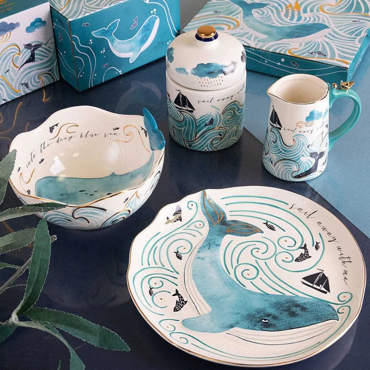 This Gorgeous Jar Is Adorned With A Stylish Design Depicting A Stormy Sea, With Plenty Of Blue Waves With Fish, Blue Whales And A Yacht. The Design Around The Jar Is Complete With The Phrase ‘Sail Away With Me’ Written In A Handwritten Font. This Ocean Themed Design Continues On The Lid With Several Stormy Clouds, In Shades Of Blue And Grey Set Against A Cream Porcelain Which Allows The Ocean Blue Shades To Standout. Gold Foil Highlights Are Used To Accentuate The Flowing Lines In The Weather Across The Whole Design, And The Knob On The Lid Is Also Topped With The Gold Foil Detail Too Adding To Its Charm. The Inside Of The Lid Is A Rubber Seal To Make Sure No Damage Comes To The Interior Of The Pot And Keeps The Lid On A More Securely.