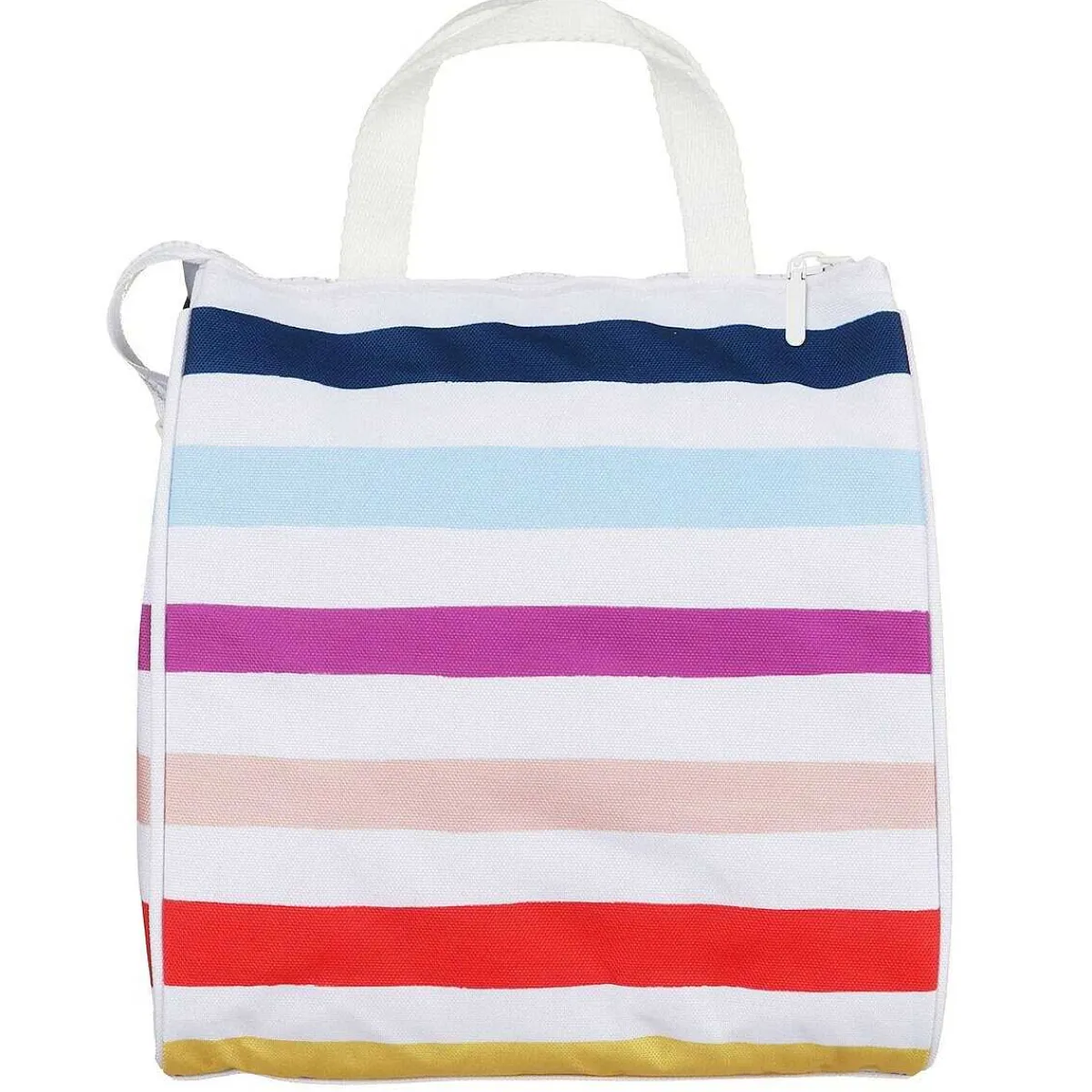 This Luxurious Lunch Bag Is Designed With The ‘Candy Stripe’ Design Which Includes Colours Such As Purple, Blue, Yellow And White. At The Top Of The Bag There Are Two White Carry Handles And Securing The Bag Is A White Zip With A Matching Zip Pull. Inside Is A Silver Insulated Lining To Keep Your Food Cold And A Mesh Pocket To Store Anything You Want Easy Access Too.