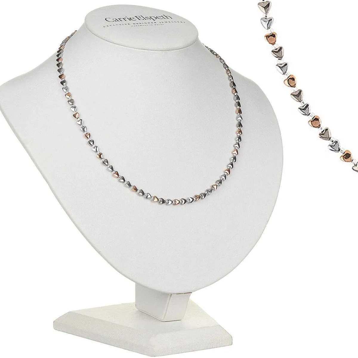 This Gorgeous Accessory From Carrie Elspeth Features Dainty Hearts In Silver And Rose Gold Which Alternate With Small Clear Spacer Beads, Allows The Delicate Hearts To Stand Out. The Necklace Is Elegant And Sophisticated, Suitable For Any Time Of Day, Morning, Or Night. The Little Hearts Sit On A Piece Of Thin Wire Which Will Add A Touch Of Sparkle And Class To Your Outfit For Any Occasion.