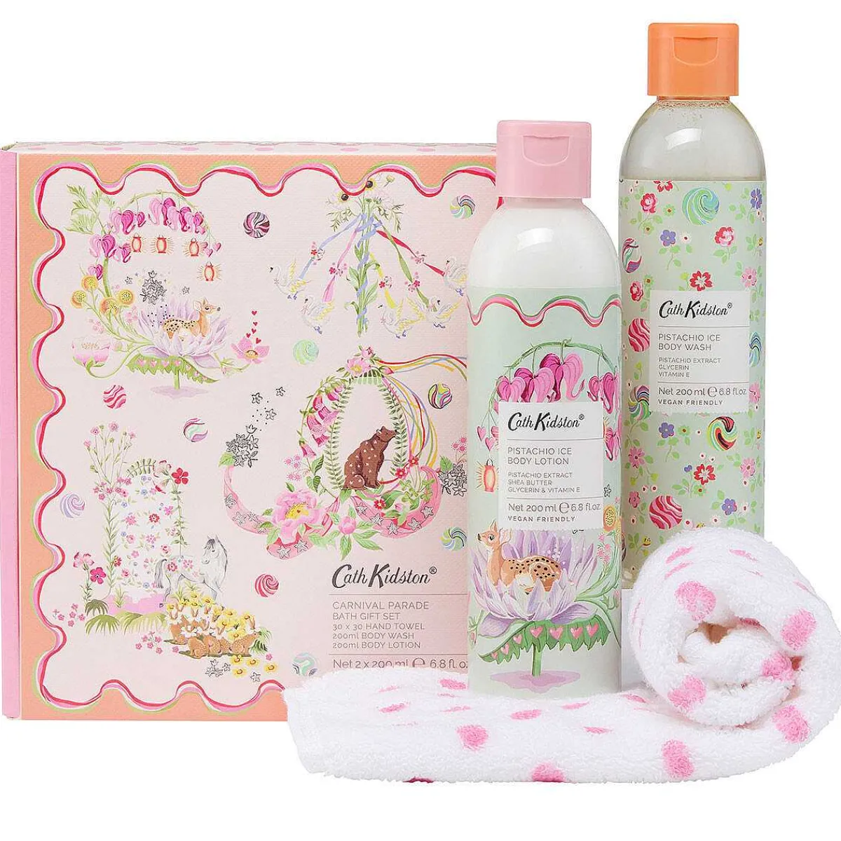 This Cath Kidston Carnival Parade Bath Gift Set From Heathcote & Ivory Has Everything You Need For A Relaxing Bath Time. This Set Includes A Body Wash, Body Lotion And A Cotton Towel.