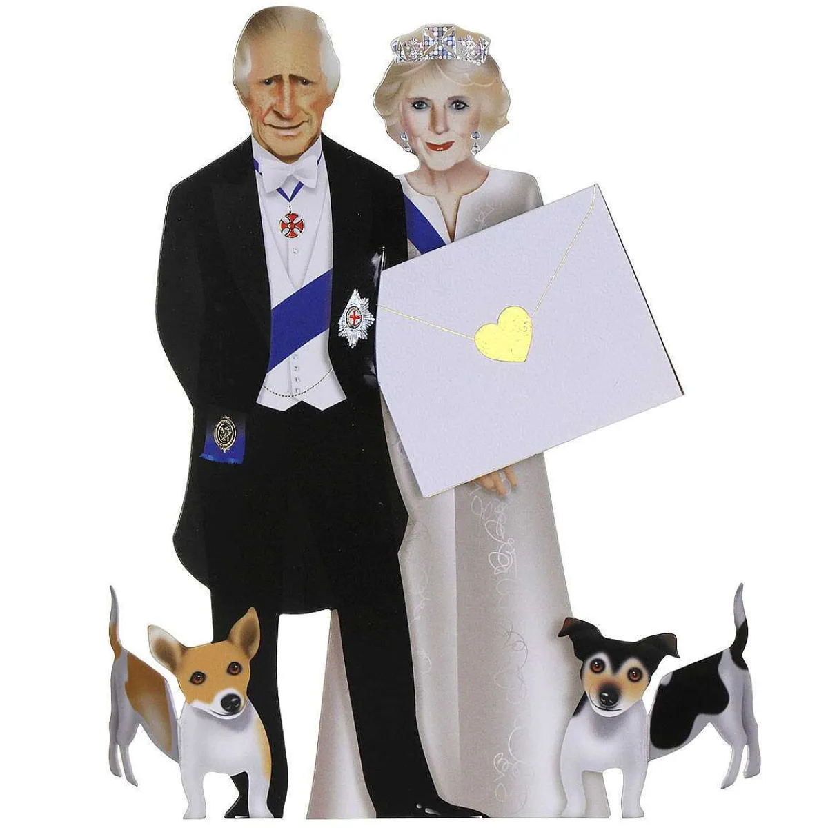 The Pair Stand Next To Each Other Holding Hands. King Charles Wears A Royal Suit Whilst Camilla Wears A Dress And A Regal Crown. Either Side Of Them Are Two Jack Russell Pups Standing Proudly. A White Card With Gold Detailing Is Tucked Under Charles’S Arm Which You Can Write Your Personalised Message Inside.