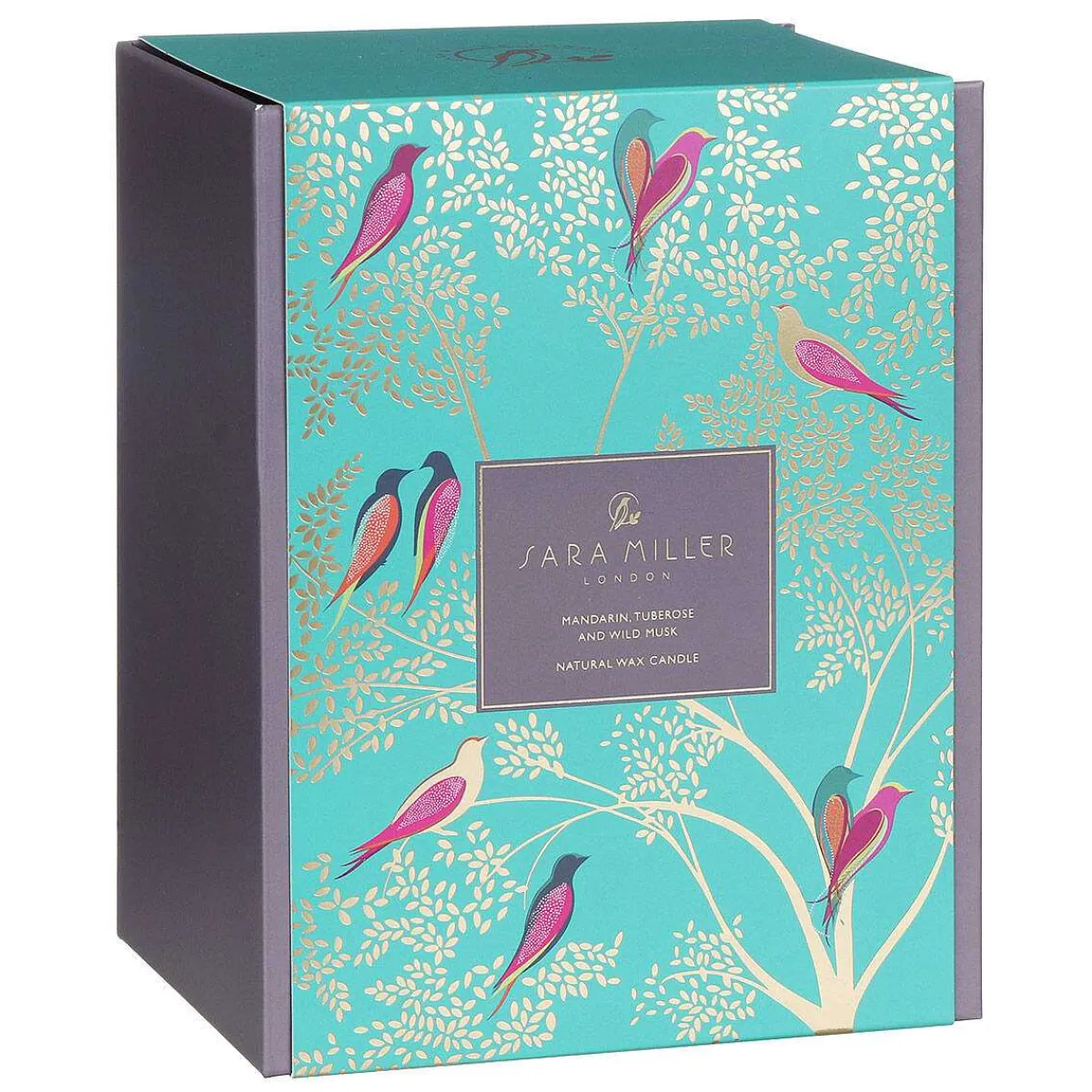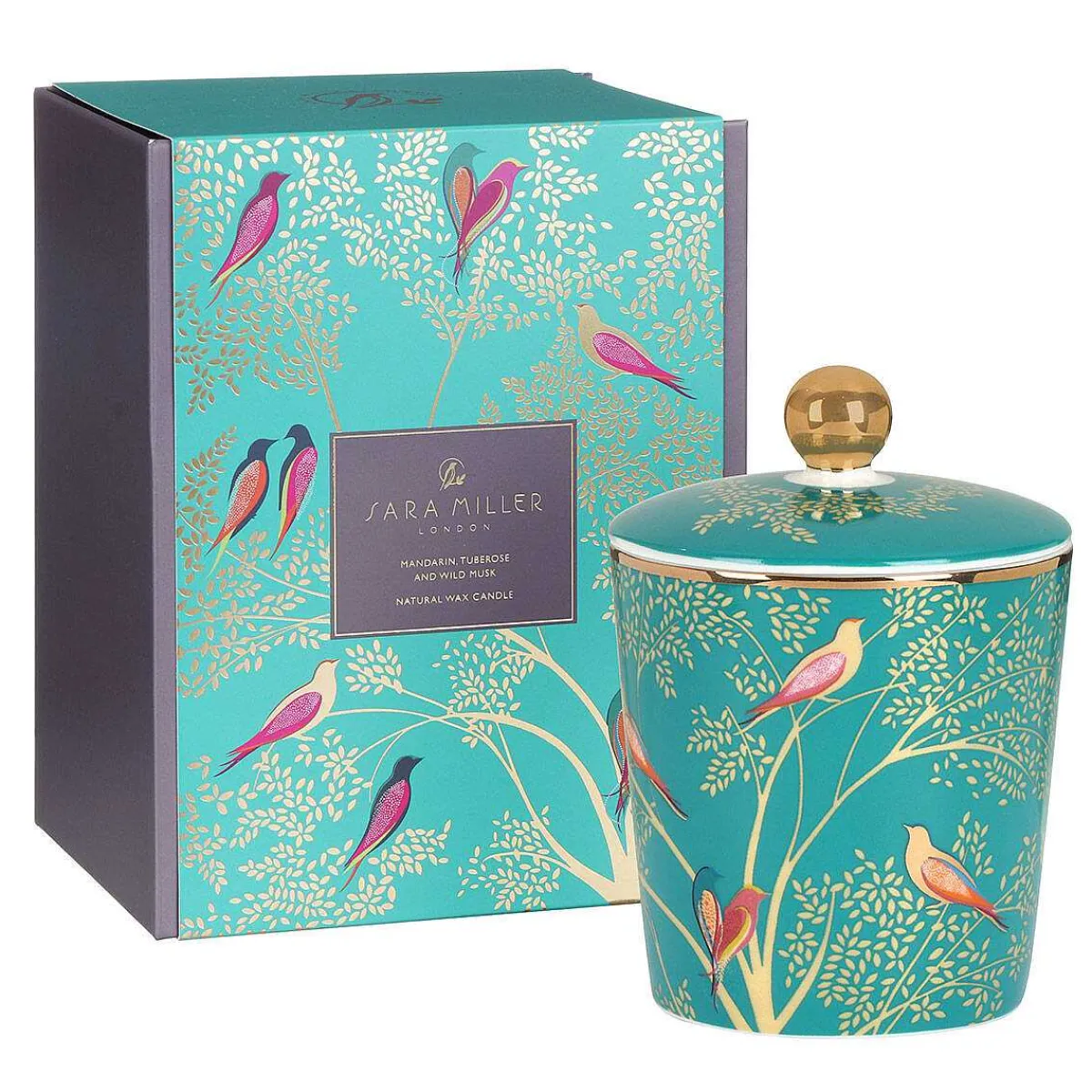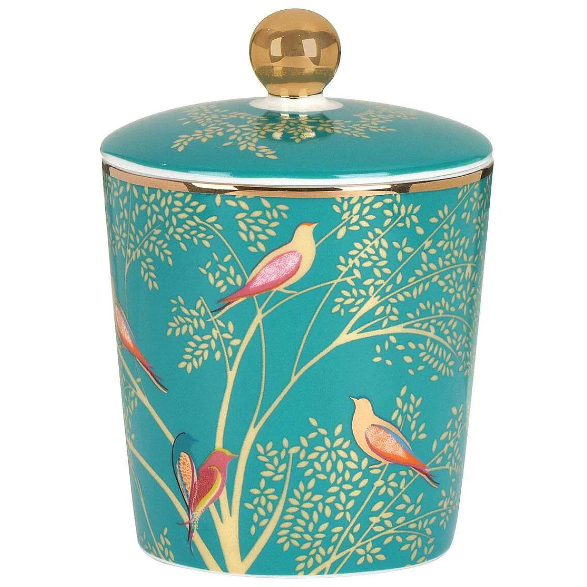 The Beautiful Fragranced Coconut Wax Candle Comes In A Ceramic Jar Which Features An Exquisite Chelsea Design From Sara Miller; Colourful Lovebirds Sit Amongst Tree Branches, Each Branch Is Adorned With Golden Foliage Set Against A Vibrant Green Background. The Sleek Jar Vessel Is Finished With 22 Carat Gold Details Including A Circle Around The Rim And Is Topped With A Lid Featuring A Golden Knob And Foliage Which Matches The Design Around The Edge Of The Vessel Completing The Sophisticated Piece Of Home Decor.