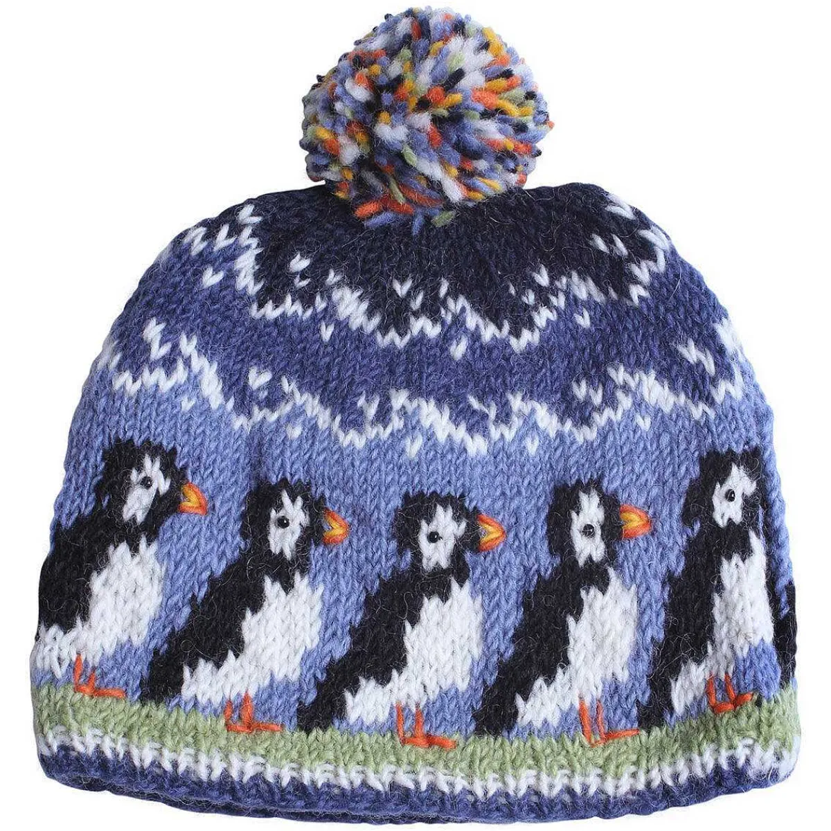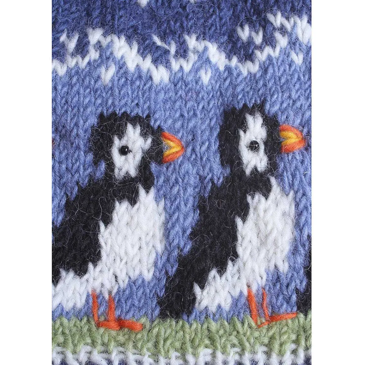 This Hand Knitted Tea Cosy Is Adorned With A ‘Circus Of Puffin’ Made From A Fine Knit Of 100% Wool. A Row Of Black And Cream Puffins With Orange Beaks And A Beaded Eye March Around The Body Of This Beanie Hat. Set Upon A Background Of Blues Interspersed With A Cream Irregular Jagged Pattern Representing The Sky. The Design Is Complete With A Green, Cream, And Blue Rim With A Little Stretch Allowing It To Sit Snugly Over Your Teapot Allowing It To Brew Nicely!