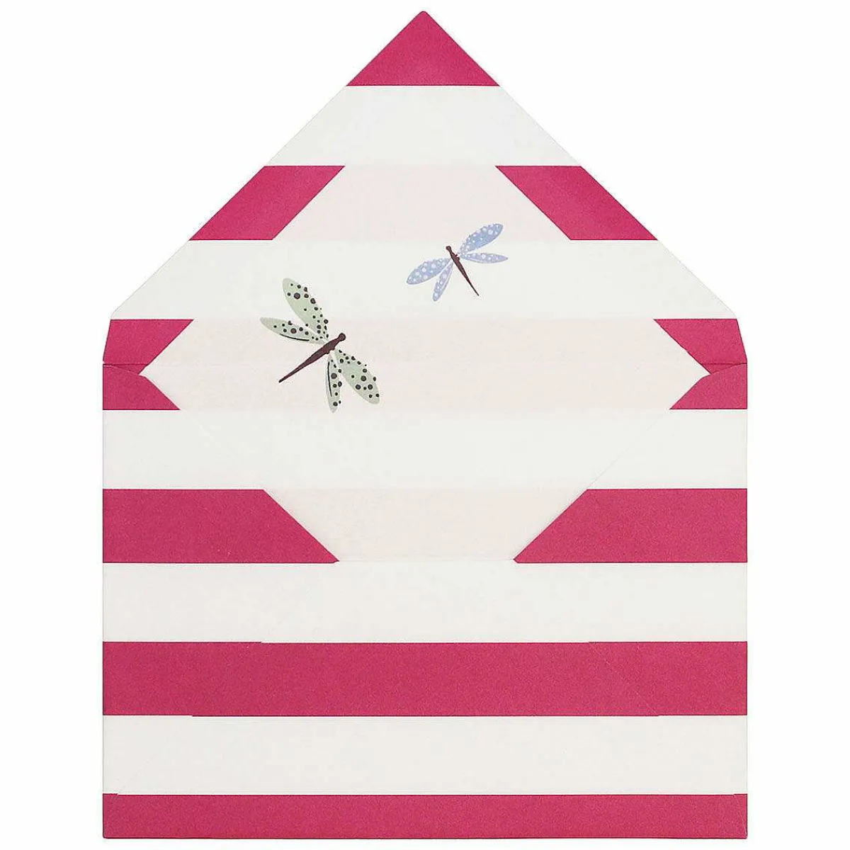 The Set Consists Of Ten Fold Over Cards Featuring The Dragonflies And Tulips Print With The Words ‘Many Thanks’ In The Centre. The Dragonflies And Tulips Print Shows A Meadow Of Colourful Tulips, Set Against A Cream Background. There Are Also Ten Envelopes Which Feature A Beautiful Bold Pink And Cream Stripe Pattern, With Dainty Dragonflies On The Inside Of The Flap.