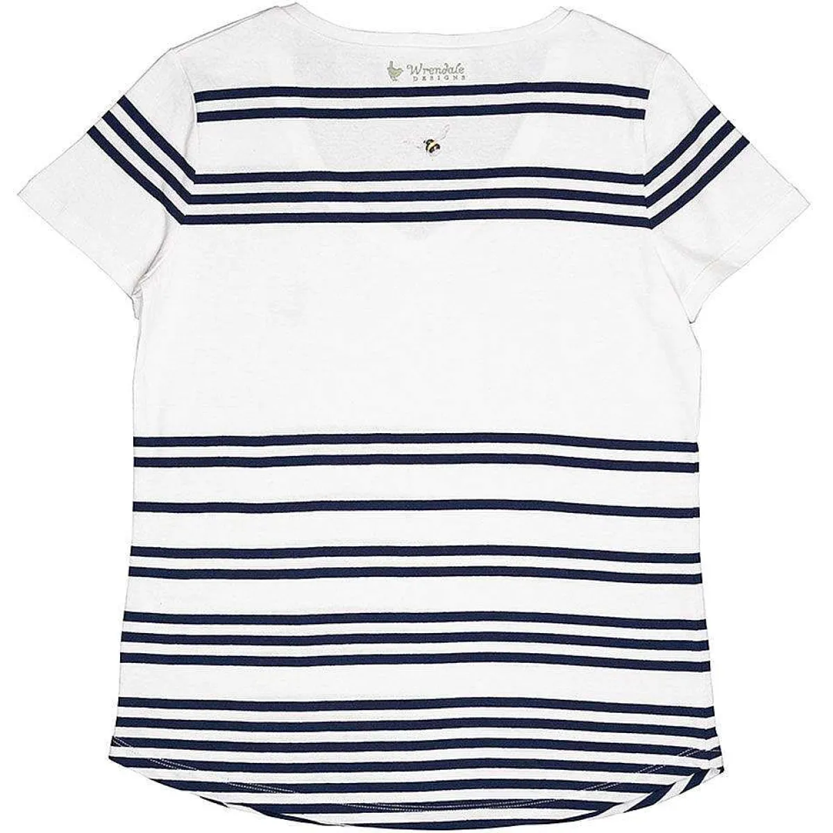 Made From High Quality Soft Cotton, This Shirt Is Soft And Comfortable For You To Wear! The Shirt Is Covered In Bold Navy Stripes On The Front And Back Which Contrast Wonderfully With The Crisp White Of The Cotton. The Front Of The Top Has An Illustration That Depicts A Bumblebee Mid-Flight, With Its Wings Spread. Speckles Of Black Paint Surrounding The Image Gives The Classic Look That Is Synonymous Of A Wrendale Design, With The Same Design Being Featured In Small On The Reverse. Finished With A Ribbed Trim On Neckline, There Is An Embroidered Wren Detail And Logo On Reverse In Wrendale Green.