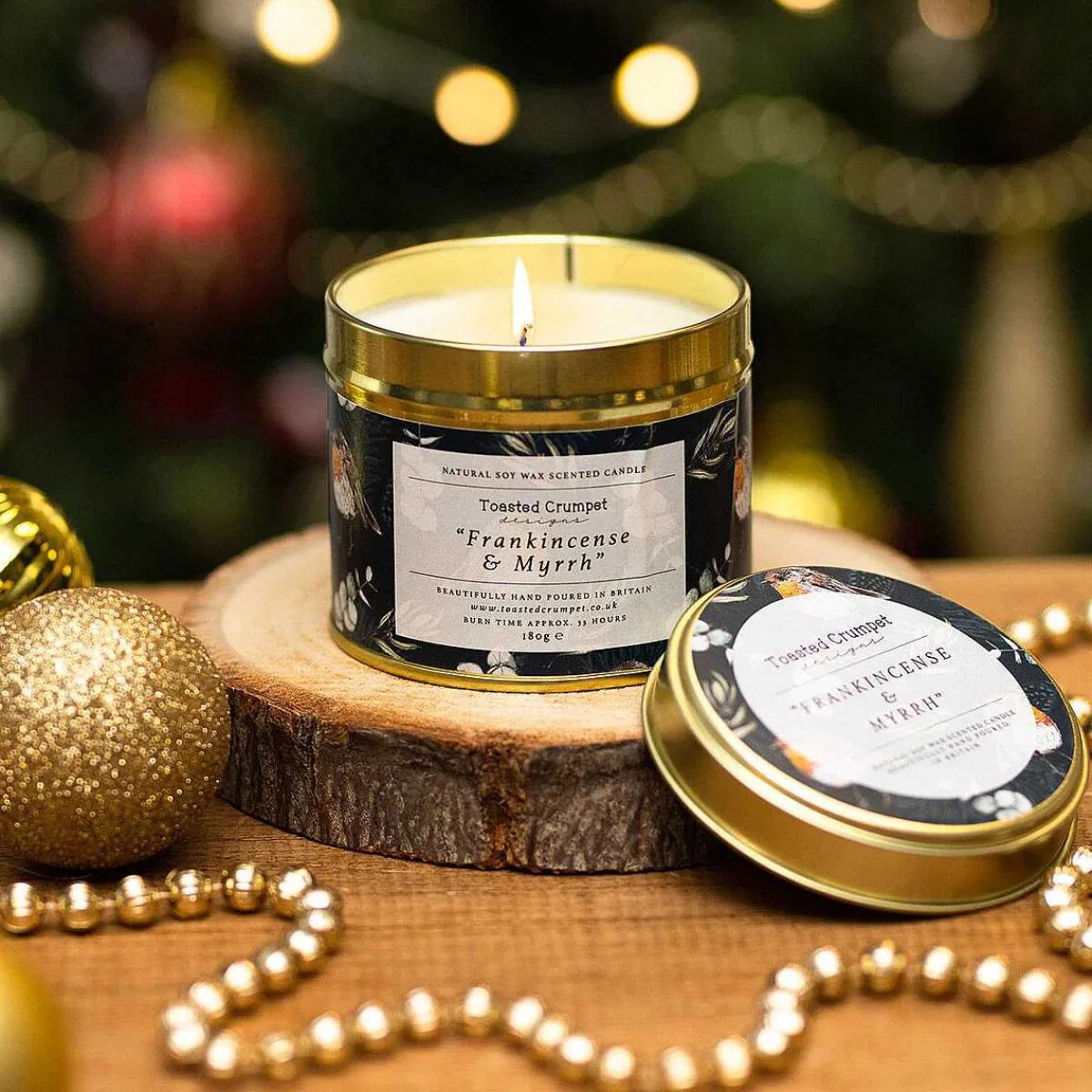 Toasted Crumpet ‘Frankincense & Myrrh’ Robin & Eucalyptus Noir Christmas Tin Candle