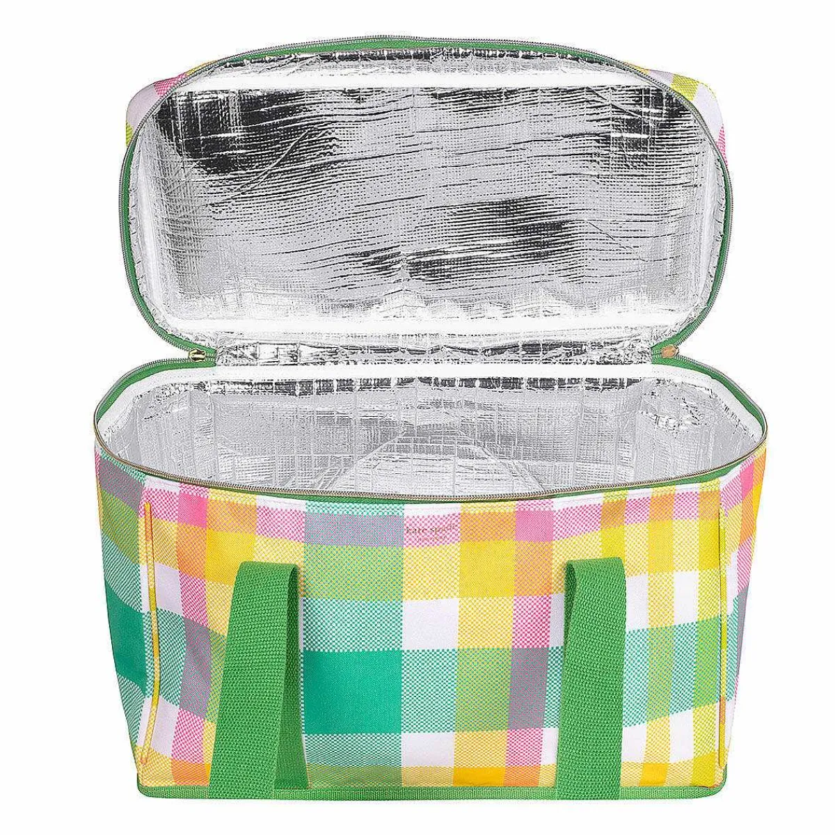 The Bag Has Silver ‘stay-Cool’ Insulated Material Around The Interior And Two Nylon Webbing, And Green Handles For You To Carry It. The Exterior Of The Bag Is Designed In The Garden Plaid Print Which Features Squares Of Plaid In Shades Of Green, Pink, White And Yellow. The Bag Sealed With A White Gold Fastener With Two Zip Pulls That Meet In The Middle To Keep Your Snacks Safe.