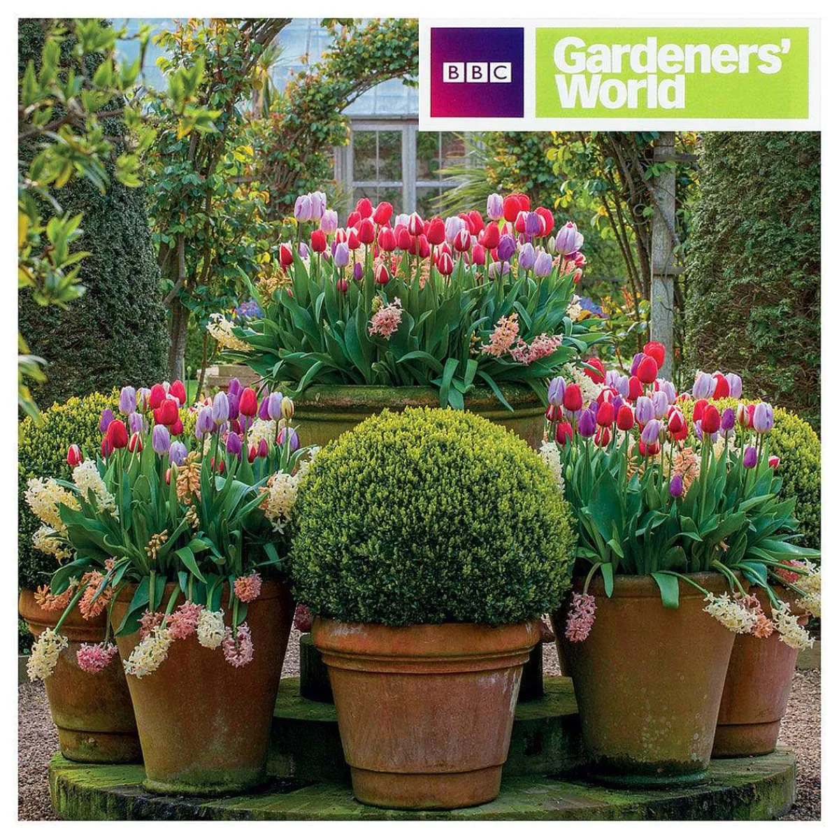 Inspired By The Bbc Programme Gardeners’ World, This Beautiful Greeting Card Features A Photograph Of A Selection Of Terracotta Plant Pots Filled With Colourful Flower Bulbs. Three Pots Show A Display Of Red And Purple Tulips Along With Pastel Hyacinth One Raised Slightly Higher To Make A Cascade Of Colour. In Between These Tulip Planters Are Vibrant Green Topiary Spheres Which Complement The Arrangement. This Gorgeous Floral Display Is Set Centre Of An Arched Pathway Leading To A Glasshouse. This Image Is Taken At East Ruston Old Vicarage Gardens In Norfolk.
