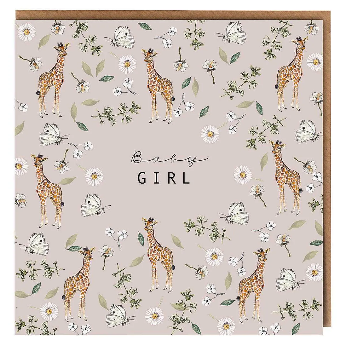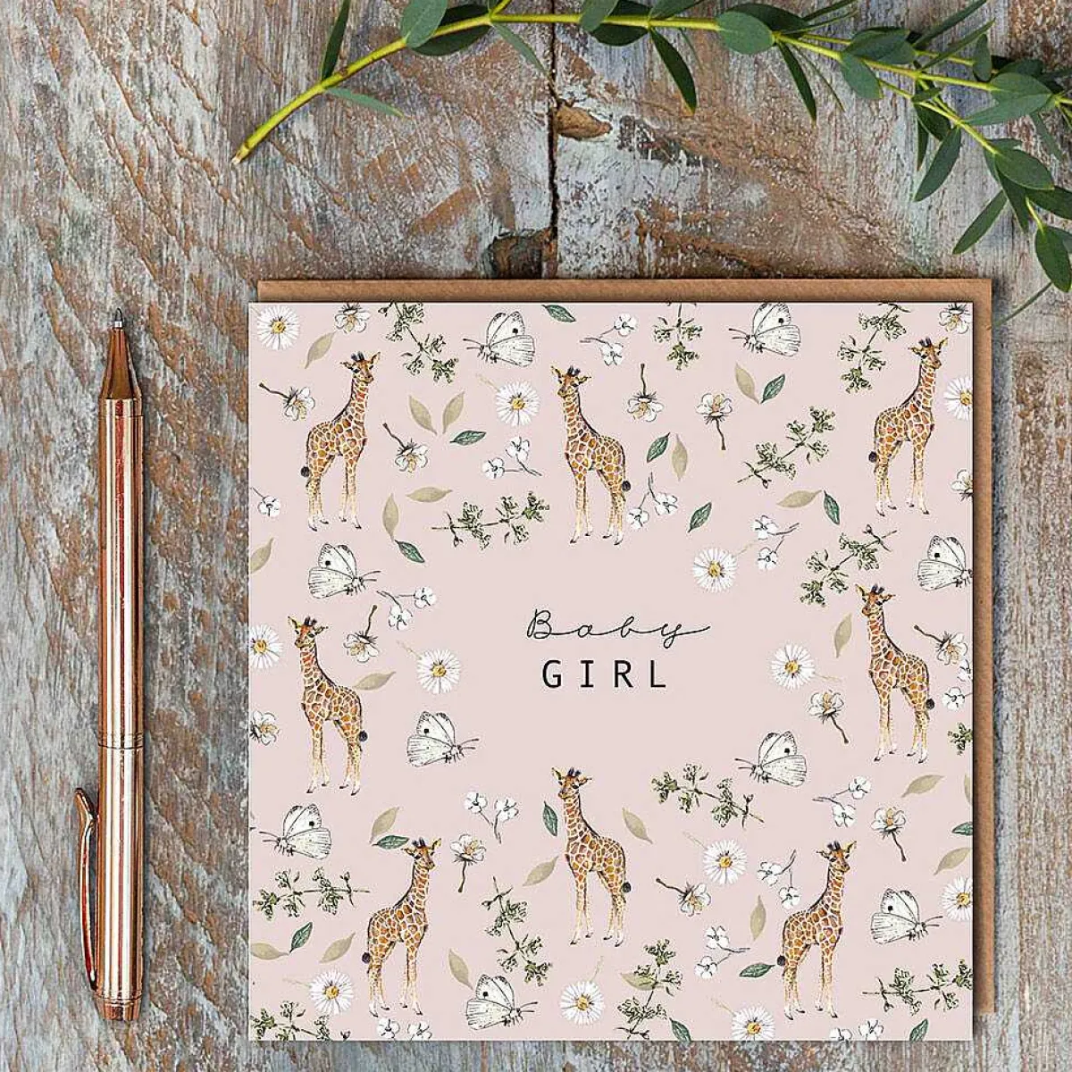 Inspired By Wildlife From Across The Globe, The Front Of The Card Is Decorated With Delightful Watercolour Illustrations Of Giraffes, Surrounded By An Assortment Of Flowers, Butterflies And Leaves On A Dusky Pink Backdrop. The Words ‘Baby Girl’ Are Written In The Centre.