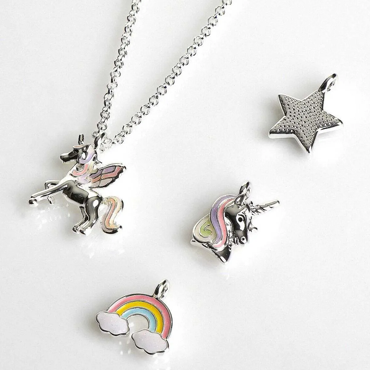A Gorgeous Selection Of Pendants Which Are Beautifully Designed Such As A Colourful Rainbow Complete With Clouds, A Glittering Star Which Shimmers In The Light And Two Magical Unicorns Complete With Silver Unicorn Horns. The Pendant Hangs From A Silver Chain Which Is Approximately 45Cm In Length Which Fastens With A Clip And Loop Mechanism. There Is Also A 5Cm Extension Chain Which Allows You To Adjust The Length To Your Liking.