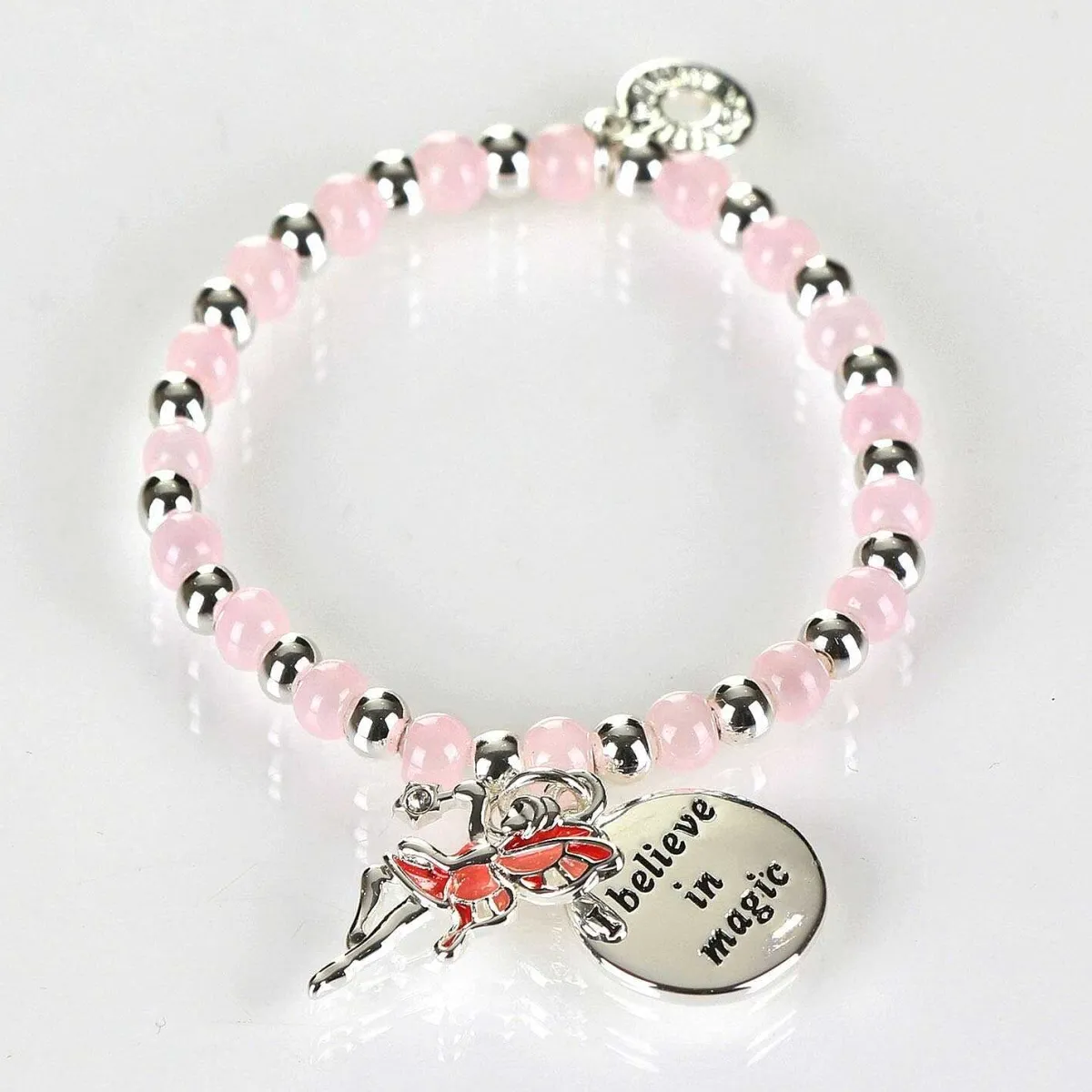 Strung On A Piece Of Elastic, It Features Alternate Pink And Silver Round Beads With A Silver Plated Charm Hanging From The Middle. The Charm Features A Sparkly, Pink Fairy Holding A Gem Encrusted Wand And A Round, Silver Pendant That Reads ‘I Believe In Magic’.